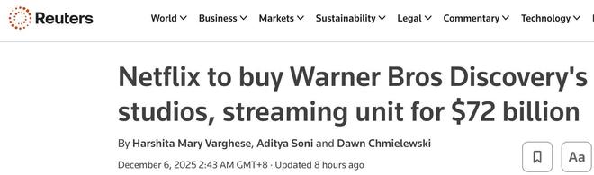 Netflix以720亿美元收购华纳兄弟探索影视工作室与流媒体业务