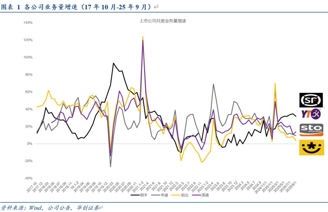 行业投资评级 - 快递行业投资评级为“推荐”,且为“维持”状态 [2] 核心观点 - 通达系(圆通、申通、韵达)单票收入环比继续提升,较7月均提升0.1元以上,后续业绩弹性可期 [2] - 8-9月单票收入数据验证了行业提价逻辑,随着10月旺季到来,预计有望进一步表现 [7] - 继续强调“反内卷”下的投资机会,后续进入“收入-业绩弹性”验证期 [7] 上市公司业务量表现 - 9月业务量同比增速:顺丰(31.8%)>圆通(13.6%)>申通(9.5%)>韵达(3.6%)[7] - 1-9月业务量累计同比增速:顺丰(28.3%)>圆通(19.4%)>申通(17.1%)>韵达(13.0%)[7] - 顺丰当月业务量为15.04亿件,圆通为26.27亿件,申通为21.87亿件,韵达为21.10亿件 [9] 上市公司收入表现 - 9月快递业务收入同比增速:申通(14.9%)=圆通(14.9%)>顺丰(14.2%)>韵达(4.1%)[7] - 1-9月收入累计同比增速:申通(14.8%)>圆通(13.5%)>顺丰(11.7%)>韵达(6.6%)[7] - 9月快递业务收入:圆通57.99亿元,顺丰208.54亿元,申通46.33亿元,韵达42.52亿元 [9] 单票收入分析 - 9月单票收入及环比变化:申通2.12元(环比+2.9%,+0.06元),韵达2.02元(环比+5.2%,+0.10元),圆通2.21元(环比+2.8%,+0.06元),顺丰13.87元(环比+4.5%,+0.60元)[7] - 9月单票收入较7月提升幅度:申通提升0.15元(+7.6%),圆通提升0.13元(+6.3%),韵达提升0.11元(+5.8%),顺丰提升0.32元(+2.4%)[7] - 1-9月累计单票收入:申通2.02元(同比-2.0%),韵达1.94元(同比-5.7%),圆通2.18元(同比-4.9%),顺丰13.83元(同比-13.0%)[7] 电商快递投资建议 - 重点推荐圆通速递:核心指标追近龙头,A股电商快递中质地最优,看好反内卷下业绩强弹性 [7] - 持续看好申通快递:“反内卷”下作为拐点型企业业绩弹性大,同时关注公司拟整合丹鸟业务带来的股东方赋能预期 [7] - 推荐极兔速递:Q3东南亚件量同比增长79%,东南亚高景气投资叠加“反内卷”有助于国内市场盈利稳定 [7] - 推荐中通快递:估值处于低位,一旦价格弹性启动,具备高性价比 [7] 顺丰控股投资建议 - 持续看好顺丰投资机会:公司激活经营策略,业务量提速推升收入增速,年初至今件量增速第一 [7] - 从自由现金流视角看,公司自由现金流可持续优化,经过股价调整后具备投资性价比 [7]