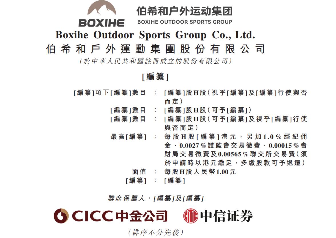 公司上市申请 - 伯希和户外运动集团股份有限公司于11月7日向港交所主板提交上市申请书 [1] - 联席保荐人为中金公司和中信证券 [1] - 公司注册于中华人民共和国 [1] 公司业务与产品 - 公司通过伯希和品牌提供户外活动、运动健身及城市通勤产品 [1] - 产品组合涵盖服装、鞋类以及装备及配饰 [1] - 产品满足男女老幼等广泛客户群的需求,适合不同季节及场合 [1] - 服装及鞋类为主要产品类别,占总销售额的大部分 [1] - 截至2025年6月30日,伯希和品牌的服装及鞋类产品包括653个标准产品单位 [1] 股票发行细节 - 将发行H股,最高发行价包含每股H股一定金额港元,另加1.0%经纪佣金、0.0027%证监会交易征费、0.00015%会财局交易征费及0.00565%联交所交易费 [2] - 股票面值为每股H股人民币1.00元 [2]
