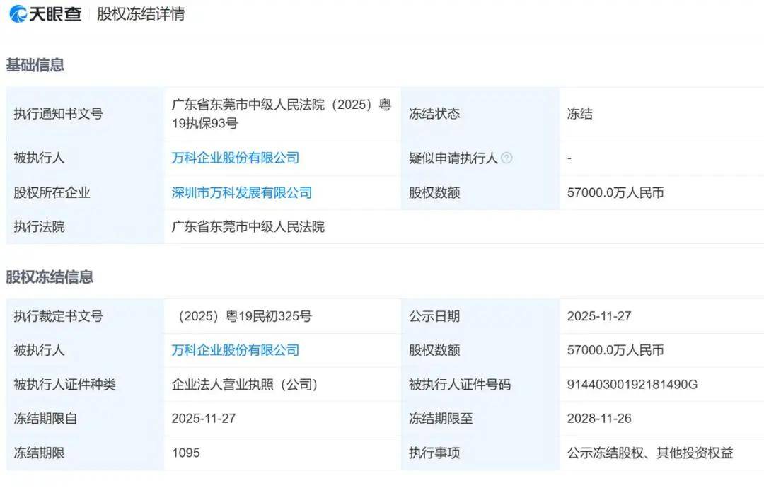 当东莞中级人民法院一纸冻结令落下,万科旗下深圳市万科发展有限公司5.7亿股权被锁定三年。这个注册资本仅6亿的子公司,几乎被全额冻结的股权数 额,像一面镜子照出了房企巨头不为人知的资金困局。 12月1日,天眼查天眼风险信息显示,万科企业股份有限公司新增一则股权冻结信息,股权所在企业为深圳市万科发展有限公司,冻结股权数额5.7亿元人 民币,冻结期限为3年,执行法院为广东省东莞市中级人民法院。 | 执行通知书文号 | 广东省东莞市中级人民法院 (2025) 粤 | 冻结状态 | 冻结 | | --- | --- | --- | --- | | | 19执保93号 | | | | 被执行人 | 万科企业股份有限公司 | 疑似申请执行人 2 | | | 股权所在企业 | 深圳市万科发展有限公司 | 股权数额 | 57000.0万人民币 | | 执行法院 | 广东省东莞市中级人民法院 | | | 目前,万科正遭遇明显的资金缺口问题。据DM查债通披露,2025年12月,该企业有两笔债券到期,到期金额总计57亿元。其中,"22万科MTN004"余额 达20亿元,利率为3%,原本的本金兑付日期是2025年12月15日。不过,在 ...
