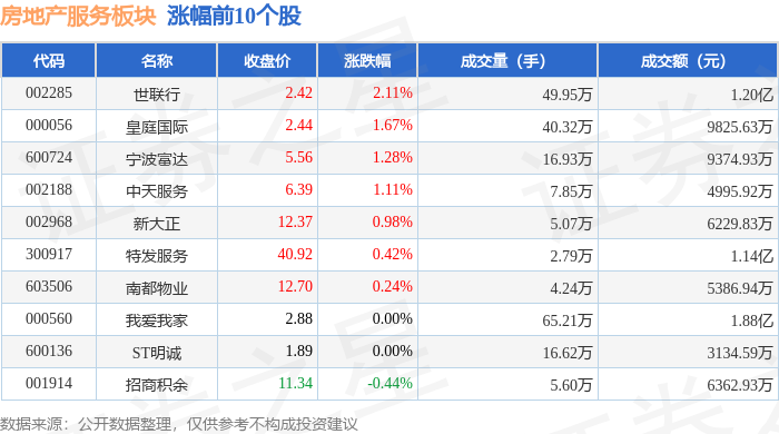 证券之星消息,11月5日房地产服务板块较上一交易日上涨0.2%,世联行领涨。当日上证指数报收于 3969.25,上涨0.23%。深证成指报收于13223.56,上涨0.37%。房地产服务板块个股涨跌见下表: | 代码 | 名称 | 收盘价 | 涨跌幅 | 成交量(手) | 成交额(元) | | --- | --- | --- | --- | --- | --- | | 002285 | 世联行 | 2.42 | 2.11% | 49.95万 | 1.20亿 | | 000056 | 皇庭国际 | 2.44 | 1.67% | 40.32万 | 9825.63万 | | 600724 | 宁波富达 | 5.56 | 1.28% | - 16.93万 | 9374.93万 | | 002188 | 中天服务 | 6.39 | 1.11% | 7.85万 | 4995.92万 | | 002968 | 新大正 | 12.37 | 0.98% | 5.07万 | 6229.83万 | | 300917 | 特发服务 | 40.92 | 0.42% | 2.79万 | 1.14亿 | | 603506 | 南都物业 | ...