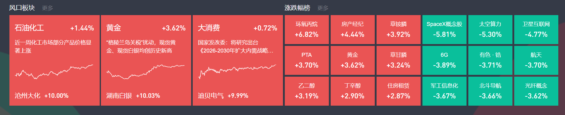 1月20日主题复盘 | 创业板大幅调整,化工股、黄金逆势走强,房地产也迎资金关注