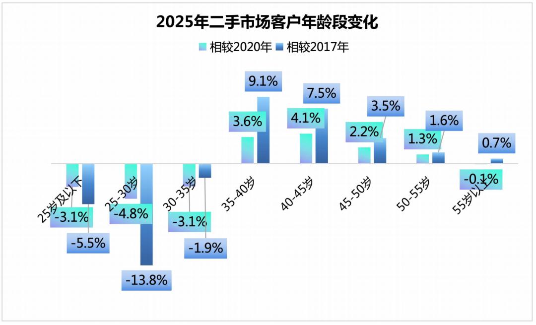 杭州二手房市场购房者结构变化 - 2025年杭州二手房购房者平均年龄为37.5岁 相比2024年上涨0.6岁 相比2017年则老了3.4岁 [1] - 35-40岁及40-45岁购房者占比持续攀升至34.1% 而25-30岁及25岁以下购房者占比则下滑至25.6% 其中25-30岁年龄段占比相比2017年大幅下滑13.8% [3] 年轻购房者需求减弱的原因 - 就业与收入的不确定性增加 使得年轻人对需要30年稳定现金流支撑的购房决策更为理性 [5] - 购房观念发生转变 “买房只涨不跌”的信仰被打破 资产保值增值预期减弱 [5] - 平均初婚年龄推迟 杭州今年初婚年龄已上升至32.3岁 进一步延迟了购房决策时间点 [5] 中年购房者成为市场主力 - 35岁及以上人群带看一次便成交的比例接近30% [6] - 35-45岁人群覆盖80后一代 其职业、收入与家庭结构最为稳定 [6] - 该群体具有三大特征:有一定财富积累、存在迫切的改善换房需求、对房产持有认知惯性并视其为安全感来源 [6] - 未来80后作为楼市买房主力的现象可能持续很长时间 [7] 中年购房者偏好分析 - 最受35岁以上购房者青睐的板块是临安 其次是未来科技城、钱江世纪城等 [8] - 购买最多的小区包括馥香园、星瓒颂锦府、桃源小镇、杭与城等 [8] - 偏好房源可归纳为三类:远郊低总价刚需房、热门地段次新房、以及带学区的次新房 [9][10] 市场偏好变化趋势 - 户型需求发生反转 60㎡以下两房成交占比从2019年的50%降至去年的36% [12] - 90㎡以上三房、四房成交占比持续上升 其中四房成交占比从2019年的6.5%提高至去年的18.1% 增长近三倍 [13] - 35岁以上人群购买四房及以上房源的比例已超过四分之一 [13] - 非热门地段的次新大户型受青睐 而缺乏学区、物业、电梯的“老破小”吸引力下降 [14] - 市场呈现两极分化趋势 同等预算下购房者更偏爱远郊但更大、更新、更好住的次新房 [15]