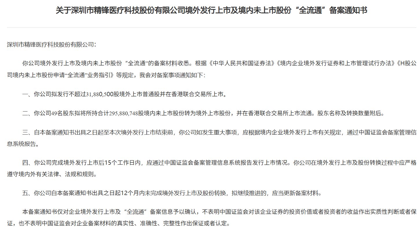 精锋医疗港股IPO及境内未上市股份“全流通”获中国证监会备案
