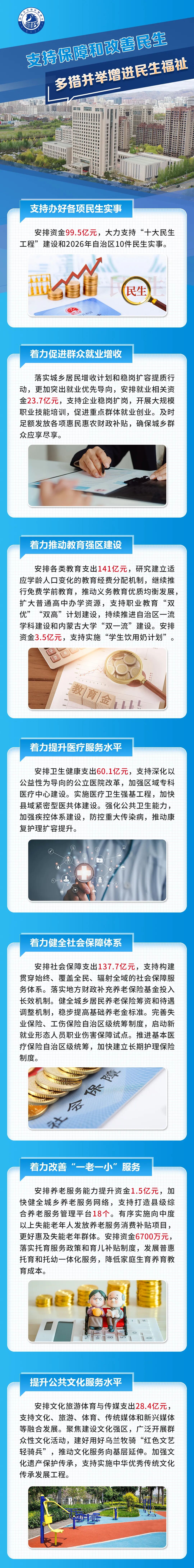 财政预算与民生支出 - 安排就业相关资金23.7亿元,用于支持企业稳岗扩岗、开展大规模职业技能培训及促进重点群体就业创业 [3][20] - 安排各类教育支出141亿元,用于研究适应学龄人口变化的教育经费分配机制、推行免费学前教育、推动义务教育优质均衡发展、扩大高中办学资源、支持职业教育和高等教育建设 [6][22] - 安排卫生健康支出60.1亿元,用于支持深化公立医院改革、加强区域专科医疗中心建设、实施医疗卫生强基工程及加快县域紧密型医共体建设 [8][24] - 安排社会保障支出137.7亿元,用于构建社会保障服务体系、落实补充养老保险基金投入长效机制、健全城乡居民养老保险机制及完善失业保险和工伤保险统筹制度 [10][27] - 安排资金99.5亿元,用于支持“十大民生工程”建设和2026年自治区10件民生实事 [18] 教育领域具体举措 - 安排资金3.5亿元,支持实施“学生饮用奶计划” [6][22] - 继续推行免费学前教育,推动义务教育优质均衡发展,扩大普通高中办学资源 [6][22] - 支持职业教育“双优”“双高”计划建设,持续推进自治区一流学科建设和内蒙古大学“双一流”建设 [6][22] 医疗与公共卫生建设 - 强化公共卫生能力,加强疾控体系建设,防控重大传染病,推动康复护理扩容提升 [8][24] - 实施医疗卫生强基工程,加快县域紧密型医共体建设 [8][24] 社会保障体系完善 - 稳步提高城乡居民基础养老金标准,健全其养老保险筹资和待遇调整机制 [10][27] - 启动新就业形态人员职业伤害保障试点,推进基本医疗保险自治区级统筹,加快建立长期护理保险制度 [10][27] “一老一小”服务改善 - 安排养老服务能力提升资金1.5亿元,加快健全城乡养老服务网络,支持打造18个县级综合养老服务管理平台 [12][29] - 有序实施向中度以上失能老年人发放养老服务消费补贴项目 [12] - 安排资金6700万元,落实托育服务政策和育儿补贴制度,发展普惠托育和托幼一体化服务 [12][30] 文化与公共服务 - 安排文化旅游体育与传媒支出28.4亿元,支持文化、旅游、体育及媒体融合发展 [14][32] - 广泛开展群众性文化活动,建好用好乌兰牧骑“红色文艺轻骑兵”,推动文化服务向基层延伸 [32] - 加强文化遗产保护传承,支持实施中华优秀传统文化传承发展工程 [32] 就业与增收支持 - 落实城乡居民增收计划和稳岗扩容提质行动,更加突出就业优先导向 [3][20] - 及时足额发放各项惠民惠农财政补贴,确保城乡群众应享尽享 [3][20]