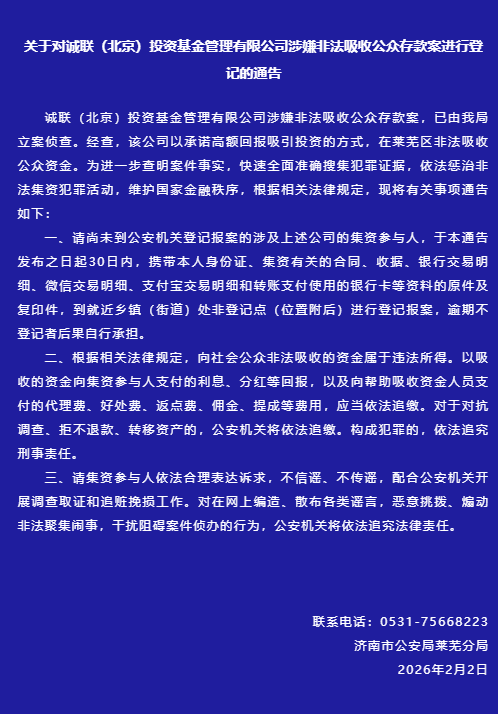 事件核心 - 2026年2月2日,济南市公安局莱芜分局对诚联(北京)投资基金管理有限公司涉嫌非法吸收公众存款案立案侦查 [1][9] - 警方通告要求集资参与人在30日内到指定登记点报案,逾期后果自行承担 [1][9] - 公安机关将依法追缴已支付的利息、分红等回报,以及支付的各类代理费、佣金等费用 [1][9] 涉事公司概况 - 公司全称为诚联(北京)投资基金管理有限公司,成立于2015年,工商登记状态为存续 [3][11] - 公司实缴资本仅504万元人民币,不足注册资本的51% [4][12] - 公司参保人数为0,且已被列入经营异常名录 [4][12] - 公司无公开的私募基金管理人登记记录,存在超范围募资嫌疑 [4][12] 公司经营与法律风险 - 公司涉及司法案件5条,开庭公告4条,且为被执行人 [4][12] - 公司涉嫌在无私募基金管理人资质的情况下,以“高额回报”为诱饵进行募资,属涉嫌非法集资 [6][14] - 公司当前经营与信用风险极高 [3][11] 投资者报案指引 - 警方公布了十五处线下报案登记地点及联系电话,覆盖莱芜区多个乡镇街道 [3][11] - 报案需准备所有材料的原件及复印件,复印件建议标注用途并签字按手印 [6][14] - 资金流水需体现交易对手、金额、时间及备注等关键信息,缺失需单独说明 [6][14] - 材料需按序整理成册,多人共同投资需各自单独报案并准备材料 [6][14] 辅助报案材料清单 - 需提供与公司业务员或客服的沟通记录,内容需体现投资推荐及高额回报承诺等 [8][16] - 需提供公司的各类宣传推广材料,内容需体现年化收益、保本承诺等信息 [8][16] - 需提供公司出具的任何加盖公章的收据、发票或凭证 [8][16] - 需提供参与公司投资宣讲会的照片、签到表等参会材料 [8][16]