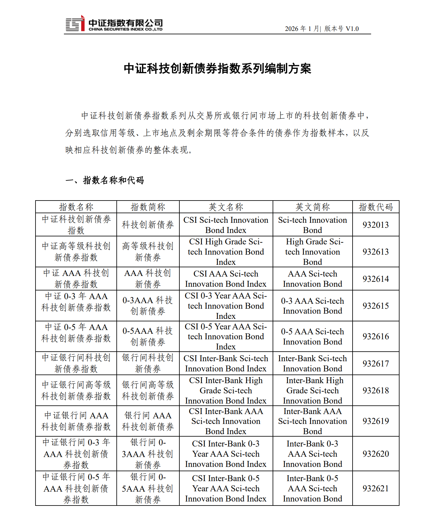 指数发布公告 - 中证指数有限公司将于2026年2月2日正式发布中证高等级科技创新债券指数等9条指数 [1] - 新指数的发布旨在为市场提供多样化的业绩基准与投资标的 [1] 指数编制方法 - 9条指数从交易所或银行间市场上市的科技创新债券中选取样本 [1] - 样本债券的筛选条件包括信用等级、上市地点及剩余期限等 [1] - 指数旨在反映相应科技创新债券的整体表现 [1] 新发布指数列表 - 中证科技创新债券指数 (简称: 科技创新债券) [3] - 中证高等级科技创新债券指数 (简称: 高等级科技创新债券) [3] - 中证AAA科技创新债券指数 (简称: AAA科技创新债券) [3] - 中证0-3年AAA科技创新债券指数 (简称: 0-3AAA科技创新债券) [3] - 中证0-5年AAA科技创新债券指数 (简称: 0-5AAA科技创新债券) [3] - 中证银行间科技创新债券指数 (简称: 银行间科技创新债券) [3] - 中证银行间高等级科技创新债券指数 (简称: 银行间高等级科技创新债券) [3] - 中证银行间AAA科技创新债券指数 (简称: 银行间AAA科技创新债券) [3] - 中证银行间0-3年AAA科技创新债券指数 (简称: 银行间0-3AAA科技创新债券) [3][4] - 中证银行间0-5年AAA科技创新债券指数 (简称: 银行间0-5AAA科技创新债券) [4]