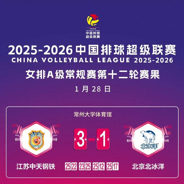 赛事结果与赛况 - 北京北冰洋女排在客场直落三局击败天津女排,收获两连胜 [1] - 比赛首局北京女排在局中打出7比1的得分高潮,以25比20拿下 [3] - 第二局北京女排在22比23落后的情况下连得三分完成逆转 [3] - 第三局北京女排以25比23拿下,从而以总比分3比0获胜 [3] 球队表现与数据 - 常规赛前七轮战罢,北京女排战绩为4胜3负,排名联赛第五 [3] - 常规赛前七轮战罢,天津女排战绩为5胜2负,排名联赛第三 [3] - 本赛季两队首次交锋时,天津女排经过五局大战艰难取胜 [3] - 随着赛季深入,北京女排二传邹佳祺逐渐激活了接应法布里斯的进攻火力 [3] 赛事背景与阵容 - 中国排球超级联赛女排A级赛事共有8支球队 [3] - 第一阶段常规赛为主客场双循环赛制 [3] - 第八轮比赛是各队交换主客场后的再次交手 [3] - 本场比赛北京女排首发阵容为主攻王云蕗、埃迪娜,二传邹佳祺,接应法布里斯,副攻单琳倩、金佳宝,自由人刘天 [3] 未来赛程 - 北京女排将于1月13日回到主场对阵河南女排 [4]