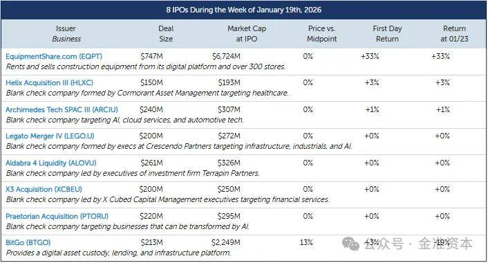 美国IPO周报回顾:设备租赁市场上涨,加密货币公司IPO数量暴跌,上周仅有两家公司上市 数字资产基础设施提供商 BitGo(BTGO)的美国IPO定价高于预期区间,以22亿美元的市值筹集了2.13 亿美元。该公司为机构客户提供数字资产托管、借贷和基础设施平台。尽管定价高于预期,且开盘即上 涨近25%,但BitGo在二级市场大幅下跌,最终收盘价较发行价低19%。 快速增长的建筑设备租赁平台EquipmentShare.com(EQPT)以发行价中点筹集了7.47亿美元,市值达到 67亿美元。该公司通过其数字平台和300多家门店出租和销售建筑设备。上市首日,该公司股价飙升 33%。 其余IPO均为SPAC。Cormorant旗下的Helix Acquisition III(HLXC)扩大了发行规模,此次发行不包含认 股权证或权利,股价上涨2.5%;Archimedes Tech SPAC Partners III(ARCIU)也扩大了发行规模。其他新 上市的SPAC包括Legato Merger IV(LEGO.U)、Aldabra 4 Liquidity(ALOVU)、Praetorian Acquisitio ...