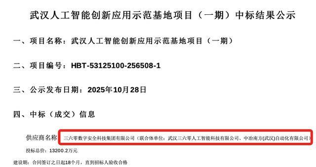 这也是继本月中标呼和浩特项目之后,该公司拿下的又一个亿元级订单。据了解,仅在十月,三六零该 业务线在AI相关项目上累计斩获金额超3亿元。除武汉项目外,10月28日,苏州三六零智能安全科技有 限公司作为联合体成员,与中移系统集成有限公司等共同中标约1.6亿元的"呼和浩特市人工智能与数字 安全产业示范基地项目EPCO总承包"项目;10月13日,宁波三六零科技有限公司中标约2268万元的"宁 波数字安全产业基地项目(信息化部分及人工智能)——算力资源租赁"项目。 新京报贝壳财经讯(记者罗亦丹)10月28日,武汉人工智能创新应用示范基地项目(一期)中标结果正 式公布,三六零(601360)数字安全科技集团有限公司以1.32亿元成功中标。 该建设内容包含五大板块,包括AI安全云建设,涵盖安全托管云平台、DeepSeek大模型一体机及大模 型开发平台,以及AI应用工场和AI学院建设,算力配套建设等。 今年9月,该项目发布招标公告,招标方为武汉长江新区长新数科信息技术有限公司,该公司创立于 2025年3月,是武汉长江新区产业投资有限公司100%控股的国有企业。项目旨在构建全方位、立体化人 工智能创新应用示范基地,依托长江新 ...