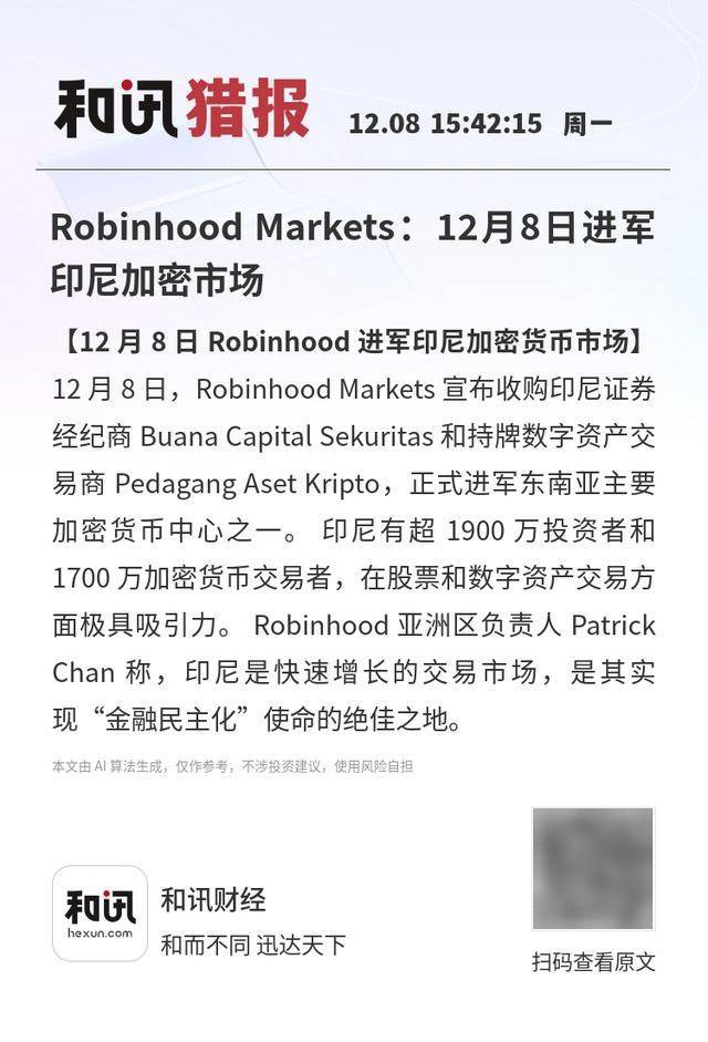 【12 月 8 日 Robinhood进军印尼加密货币市场】12 月 8 日,Robinhood Markets 宣布收购印尼证券经纪 商 Buana Capital Sekuritas 和持牌数字资产交易商 Pedagang Aset Kripto,正式进军东南亚主要加密货币 中心之一。 印尼有超 1900 万投资者和 1700 万加密货币交易者,在股票和数字资产交易方面极具吸引 力。 Robinhood 亚洲区负责人 Patrick Chan 称,印尼是快速增长的交易市场,是其实现"金融民主化"使 命的绝佳之地。 和讯财经 和而不同 迅达天下 扫码查看原文 Robinhood Markets: 12月8日进军 印尼加密市场 【12月8日 Robinhood 进军印尼加密货币市场】 12 月 8 日,Robinhood Markets 宣布收购印尼证券 经纪商 Buana Capital Sekuritas 和持牌数字资产交 易商 Pedagang Aset Kripto,正式进军东南亚主要 加密货币中心之一。 印尼有超 1900 万投资者和 1700 万加密货币交易者,在股票和数字资产交易方 面极具吸引力 ...