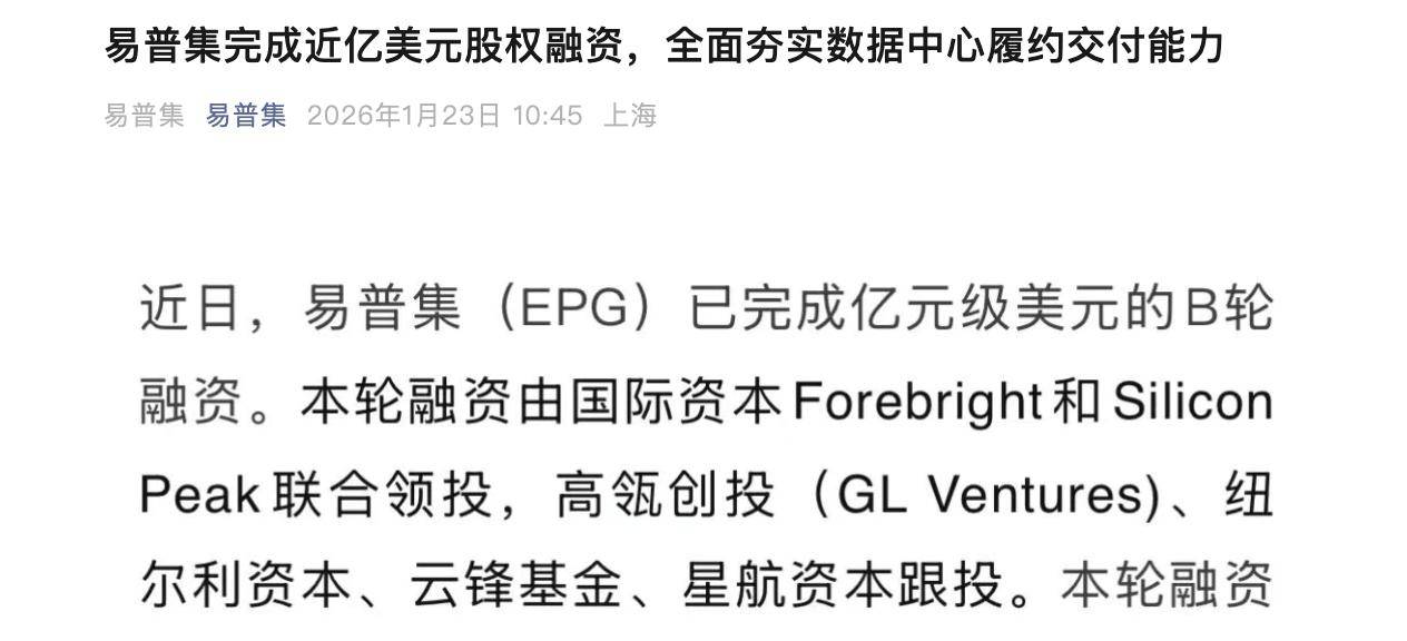 在核心技术层面,公司已自研突破液冷系统和柴油发电机组等关键产品。其冷板式液冷方案通过独特的管路设计与冷却液选型,可满足最新一代高功率GPU 服务器的散热需求,将数据中心能效(PUE)降低至1.3以下。而自研的柴发机组则瞄准了海内外市场长期紧缺的备用电源供应。 相关公司:普集 瑞财经 刘治颖 近日,易普集(EPG)已完成亿元级美元的B轮融资。本轮融资由国际资本Forebright和Silicon Peak联合领投,星航资本、高瓴创投(GL Ventures)、纽尔利资本、云锋基金跟投。 本轮融资将主要用于产能扩建、运营资金补充及全球市场拓展,以更好的保障客户数据中心交付,特别是AI算力推动下的高功率密度数据中心(AIDC)。 2025年,公司还完成了钟鼎资本等投资机构的共计数千万美元的A轮、A+轮的融资。 易普集成立于2004年,公司定位为模块化数据中心(MDC)解决方案提供商,通过将发电、配电、IT、制冷四大核心模块在工厂进行标准化预制与集成, 大幅缩短数据中心的建设周期并降低成本。公司在海外已建立超级工厂和整建制交付团队,帮助客户进行全球数据中心交付。 ...