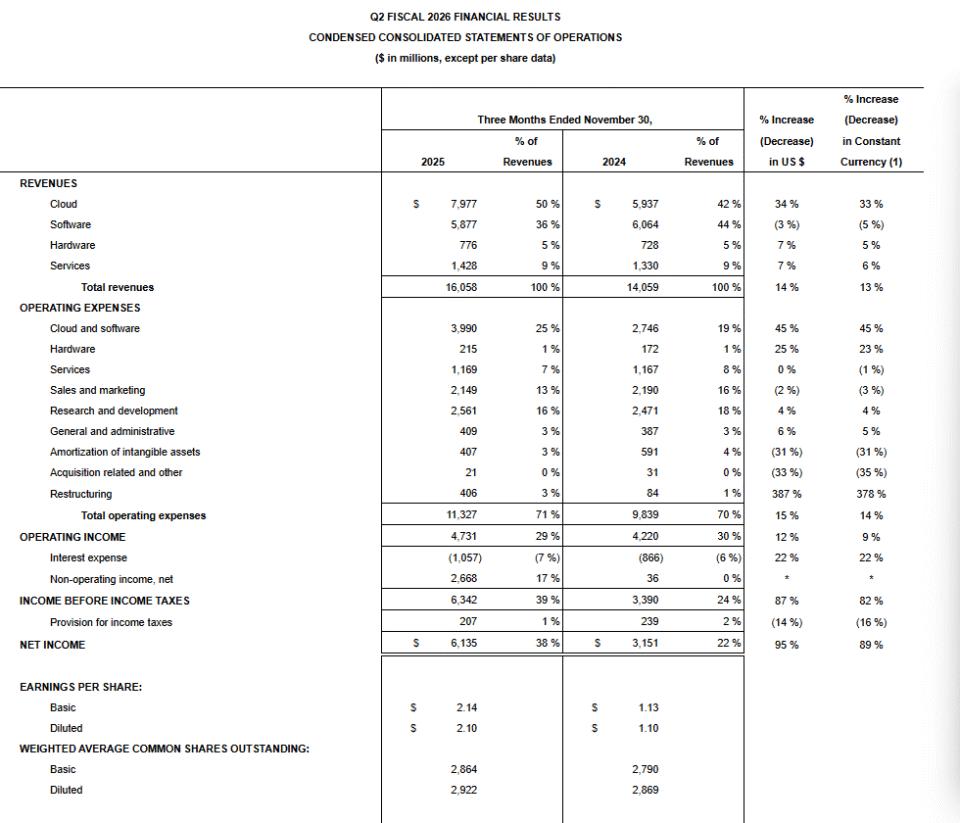 北京时间12月11日,甲骨文发布了该公司截至2025年11月30日的2026财年第二财季(对应2025年9月至11月)财报。 报告显示,甲骨文第二财季总营收为160.58亿美元,与去年同期的140.59亿美元相比增长14%,不计入汇率变动的影响为同比增长13%。 据LSEG提供的数据显示,分析师此前平均预期甲骨文第二财季营收将达162.1亿美元。 | | | | | | | | | % Increase | | --- | --- | --- | --- | --- | --- | --- | --- | --- | | | | | Three Months Ended November 30, | | | | % Increase | (Decrease) | | | | | % of | | | % of | (Decrease) | in Constant | | | 2025 | | Revenues | 2024 | | Revenues | in US $ | Currency (1) | | REVENUES | | | | | | | | | | Cloud | S | 7,977 | 50 ...