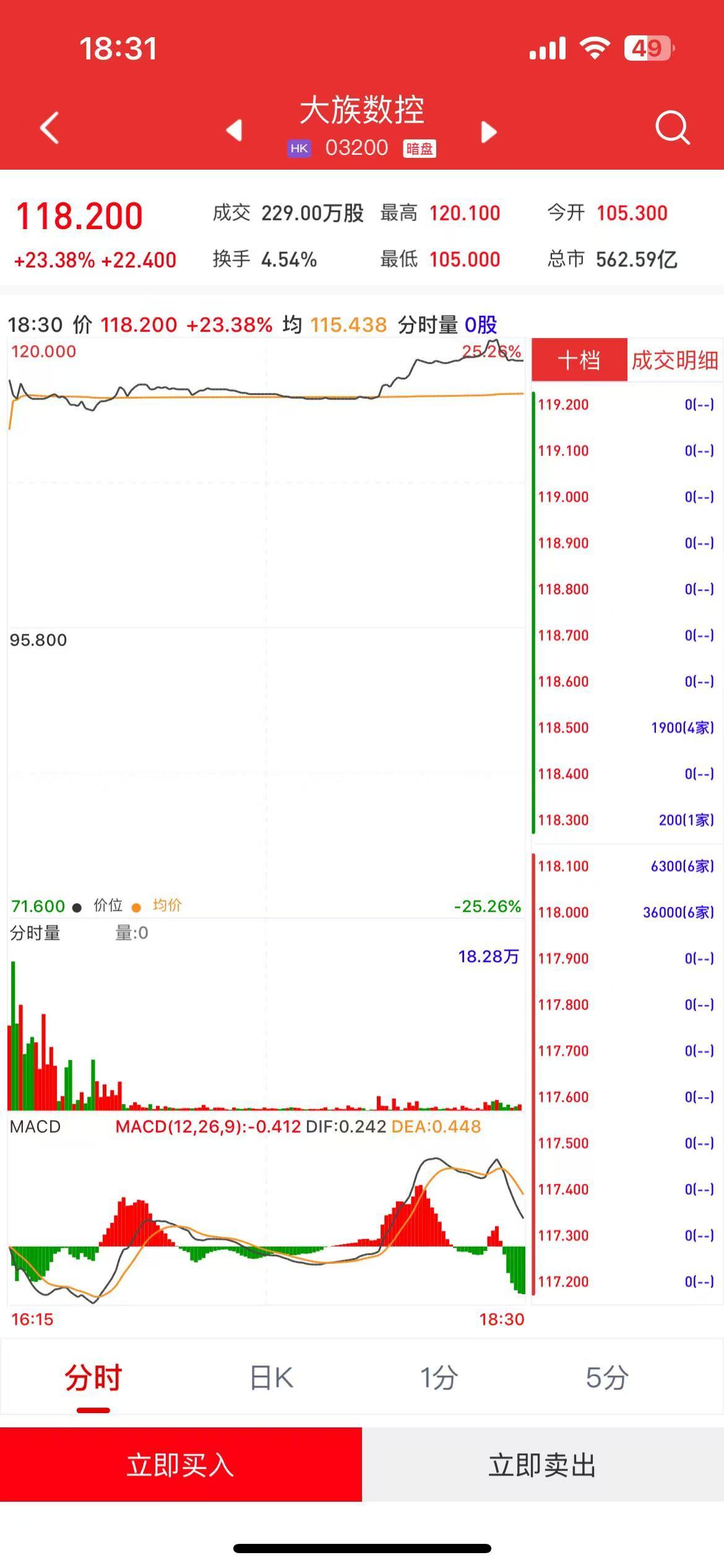 上市与交易信息 - 公司将于2月6日(星期五)在香港挂牌上市 [1] - 根据利弗莫尔证券暗盘交易数据,公司股票报价为118.2港元,较招股价95.8港元上涨23.38% [1] - 以每手100股计算,不计手续费,每手可赚2240港元 [1] 暗盘交易行情 - 暗盘交易中,公司股票价格在117.200港元至118.28万港元(此处原文“18.28万”疑为“118.28”之误)的区间内波动 [3] - 行情图表显示分时、1分、5分及日K线数据 [3] - 技术指标MACD(12,26,9)显示数值为-0.412,其中DIF为0.242,DEA为0.448 [3]