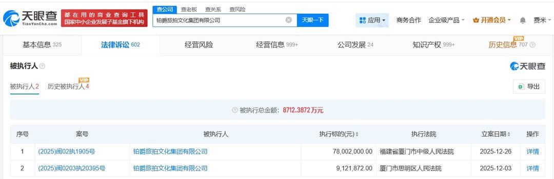 铂爵旅拍及其董事长等再被执行7800万元
