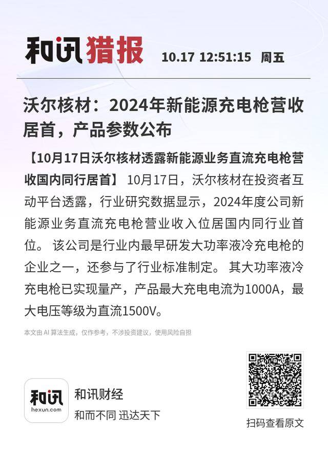 沃尔核材:2024年新能源充电枪营收居首,产品参数公布