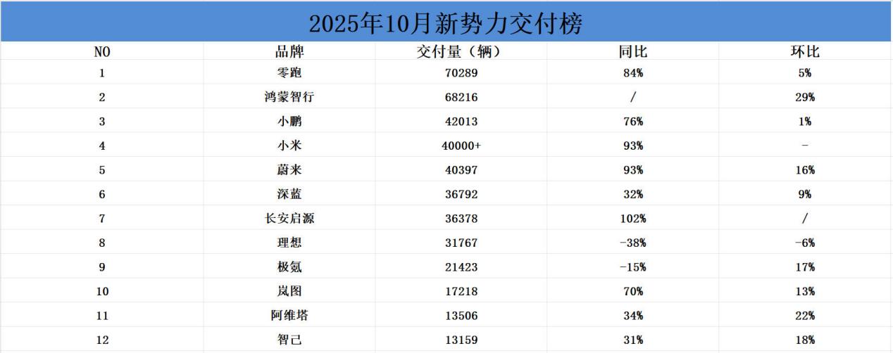 2025年10月,国内新能源汽车市场热度延续,新势力品牌表现尤为抢眼。各企业发布的数据显示,该月不仅迎来头部阵营销量"破纪录"的狂欢,也见证第二 梯队的强势突围,市场格局迎来新的转折点。 | | | 2025年10月新势力交付榜 | | | --- | --- | --- | --- | | NO | 品牌 | 交付量(辆) | 同比 | | 1 | 零跑 | 70289 | 84% | | 2 | 鸿蒙智行 | 68216 | 1 | | 3 | 小鹏 | 42013 | 76% | | 4 | 小米 | 40000+ | 93% | | 5 | 蔚来 | 40397 | 93% | | 6 | 深蓝 | 36792 | 32% | | 7 | 长安启源 | 36378 | 102% | | 8 | 理想 | 31767 | -38% | | a | 极氨 | 21423 | -15% | | 10 | 岚图 | 17218 | 70% | | II | 阿维塔 | 13506 | 34% | | 12 | 智己 | 13159 | 31% | 头部格局生变 零跑破7万稳居榜首 零跑汽车10月交付新车702 ...