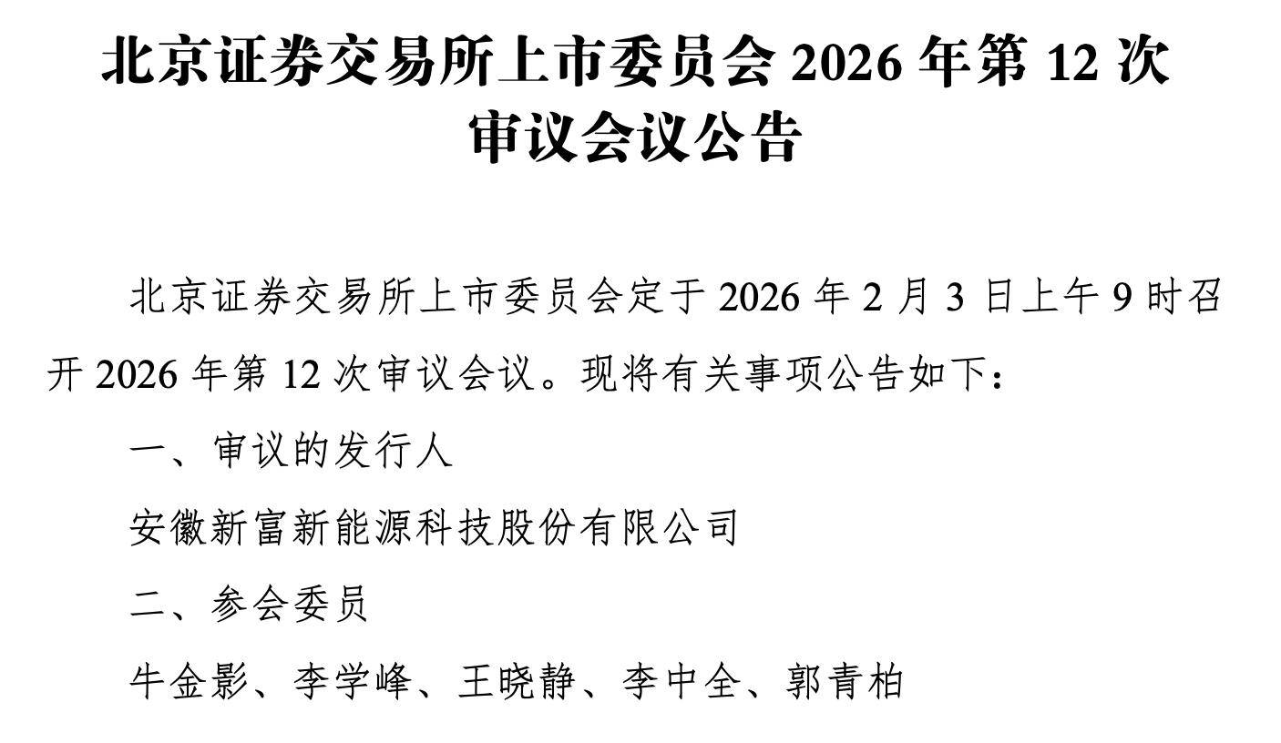 新富科技本次发行的保荐人、主承销商为中信证券股份有限公司,签字保荐代表人为万同、姚玉洁。 截至招股说明书签署日,安庆创新壹号企业管理合伙企业(有限合伙)(以下简称"创新壹号")持有新 富科技14,817,302股股份,持股比例为42.72%,是单一持股比例最大股东,为新富科技的控股股东。 截至招股说明书签署日,潘一新通过担任新富科技股东创新壹号、安庆创新贰号企业管理合伙企业(有 限合伙)、安庆创新叁号企业管理合伙企业(有限合伙)及安庆创新肆号企业管理合伙企业(有限合 伙)的普通合伙人,间接控制新富科技61.83%股份;潘一新为新富科技的实际控制人。 中国经济网北京1月27日讯 据北交所网站消息,北京证券交易所上市委员会定于2026年2月3日上午9时 召开2026年第12次审议会议,审议的发行人为安徽新富新能源科技股份有限公司(以下简称"新富科 技")。 新富科技本次拟在北交所上市,拟募集资金40,930.57万元,全部用于新能源汽车热管理系统核心零部件 扩产建设项目。 (责任编辑:马欣) ...