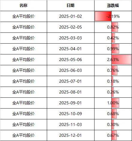 数据显示,全A平均股价只在1月2日是收跌的,后面11个月都有开门红。 | 名称 | 日期 | 涨跌幅 | | --- | --- | --- | | 全A平均股价 | 2025-01-02 | -2 19% | | 全A平均股价 | 2025-02-05 | 0.82% | | 全A平均股价 | 2025-03-03 | 0.42% | | 全A平均股价 | 2025-04-01 | 0.99% | | 全A平均股价 | 2025-05-06 | 2.63% | | 全A平均股价 | 2025-06-03 | 0.76% | | 全A平均股价 | 2025-07-01 | 0.18% | | 全A平均股价 | 2025-08-01 | 0.26% | | 全A平均股价 | 2025-09-01 | 1.00% | | 全A平均股价 | 2025-10-09 | 0.68% | | 全A平均股价 | 2025-11-03 | 0.30% | | 全A平均股价 | 2025-12-01 | 0.67% | 12月1日,市场震荡拉升,沪指重返3900点上方,深成指、创业板指均涨超1%。截至收盘,沪指涨 0.65%, ...