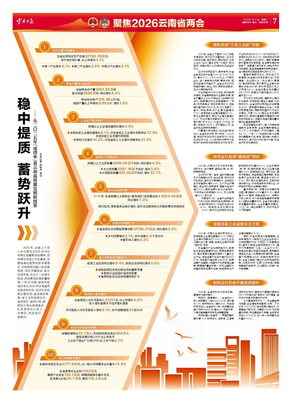 宏观经济表现 - 2025年全省地区生产总值(GDP)达32765.78亿元,按不变价格计算同比增长4.1% [2][8] - 人均GDP迈上1万美元台阶 [8] - 三次产业协调增长,第一产业增长3.1%,第二产业增长2.9%,第三产业增长5.1% [2] - 第三产业对经济增长贡献率达67.3% [8] - 居民消费价格(CPI)与上年持平,工业生产者出厂价格(PPI)同比下降0.7% [3][11] - 外贸进出口总额增长10.2%,较上年提高14.1个百分点 [4][11] 产业发展与结构 - 规模以上工业增加值同比增长4.5% [2] - 非烟非能工业增加值增长8.1%,对全省规上工业增长贡献率达72.9% [2][13] - 有色金属行业增加值增长14.2%,对全省规上工业增长贡献率达31.5% [2] - 新能源电池产业增加值增长75.9% [8][13] - 服务业加快发展,1-11月规模以上服务业营业收入3524.48亿元,同比增长7.3% [2] - “旅居云南”成为大IP,旅居人数超过550万人,平均居住83天 [8] 农业与粮食生产 - 全省粮食总产量2001.89万吨,首次突破2000万吨,同比增长0.4% [2] - 粮食综合单产315.98公斤/亩,每亩产量比上年增加3.05公斤,增长1.0% [2] - 高原特色农业蓬勃发展,优质鲜切花占比、咖啡精深加工率显著提升 [8] 能源与工业产出 - 规模以上工业发电量4596.05亿千瓦时,同比增长4.2% [2] - 太阳能发电量401.33亿千瓦时,同比增长33.7% [2] - 清洁电力占比达87.6% [11] - 有色金属产业总产值达到4975亿元,绿色铝产值突破2000亿元 [8][13] - 稀贵金属产业集群入选国家级先进制造业集群,锡铟锗产量全球第一 [13] 投资与消费 - 投资结构实现“两个转变”:产业投资占比达52.1%,成为拉动主力;民间投资占比达42.9% [9] - 产业民间投资占全部民间投资比重达65.1% [11] - 能源工业投资同比增长9.4%,旅游业投资同比增长5.0% [3] - 全省社会消费品零售总额12786.21亿元,同比增长2.4% [2] - 乡村消费增长3.1%,快于城镇0.9个百分点;餐饮收入增长4.2% [2] - 房地产市场回暖,商品房销售面积保持正增长,省外群体购买商品住房比例达32.1% [9] 居民收入与就业 - 全省居民人均可支配收入31311元,比上年增长4.6%,收入增速快于经济增速 [3] - 农村居民人均可支配收入增长6.1%,快于城镇居民3个百分点 [3] - 城镇新增就业51.1万人,农民就地就近就业856万人 [3] - 调查失业率均值为5.2% [11] 财政运行 - 全省地方一般公共预算收入完成2243.3亿元,同比增长2.3%,其中税收收入增长6.6% [5][14] - 全省地方一般公共预算支出首次突破7000亿元,增长2% [5][14] - 全年民生支出5177.9亿元,占一般公共预算支出比重达73.9% [5][6][14] - 统筹超2500亿元支持重点领域发展 [5][14] 市场主体与营商环境 - 全省经营主体总量达688.3万户 [9] - 民营经济增加值占GDP比重升至53.5%,增速高于GDP增速,贡献率超55% [9][12] - 通过创新机制累计帮助企业解决问题诉求超4000项,新引进落地亿元以上项目904个 [9] - 国家级制造业单项冠军达9户,国家级专精特新“小巨人”企业达92户 [13] 基础设施建设与创新 - 全省算力规模超4000P [13] - 昆明国际通信业务出入口局实现贯通互联 [9] - 完成对2.3万家单位的“起底式”资产清查,推动资产共享与数据资产试点 [5][14]