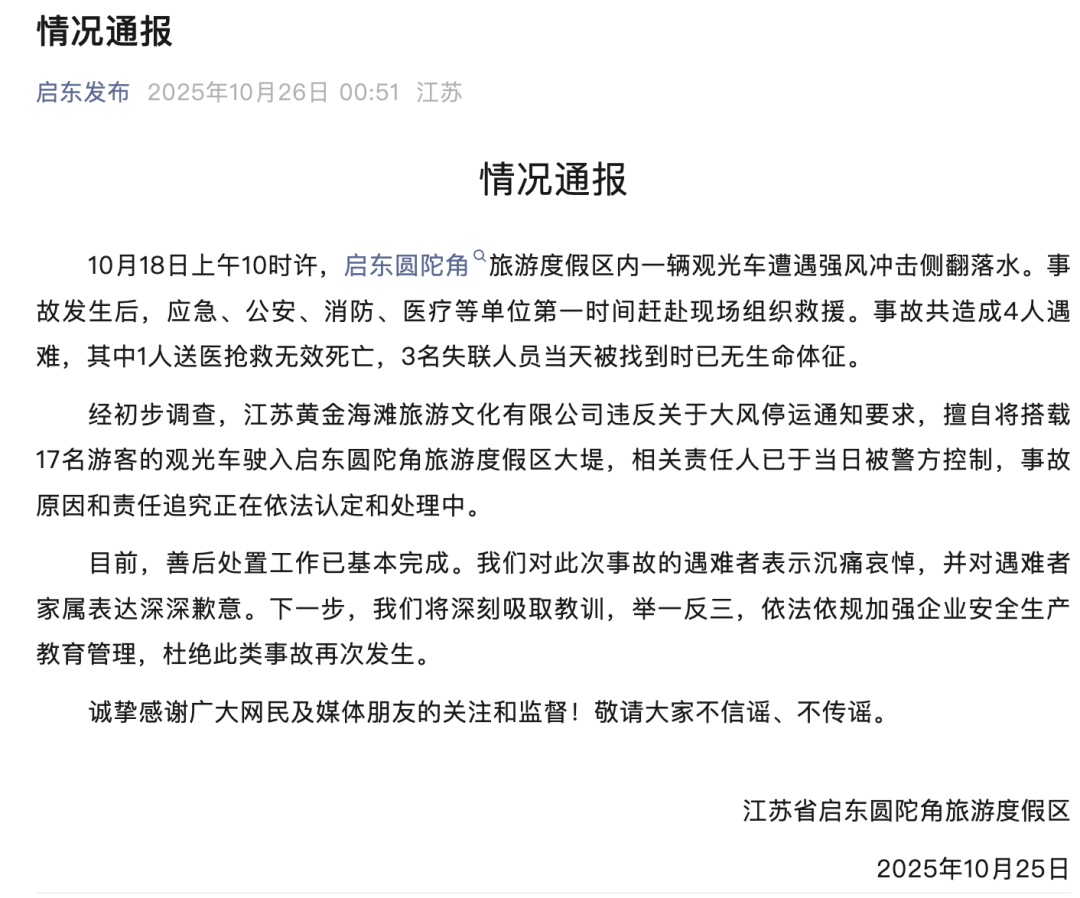 经初步调查, 江苏黄金海滩旅游文化有限公司违反关于大风停运通知要求,擅自将搭载17名游客的观光车驶入启东圆陀角旅游度假区大 堤,相关责任人已于当日被警方控制,事故原因和责任追究正在依法认定和处理中。 目前,善后处置工作已基本完成。 据央视新闻,10月18日上午10时许,启东圆陀角旅游度假区内一辆观光车遭遇强风冲击侧翻落水。事故发生后,应急、公安、消防、医疗 等单位赶赴现场组织救援。 事故共造成4人遇难,其中1人送医抢救无效死亡,3名失联人员当天被找到时已无生命体征。 ...