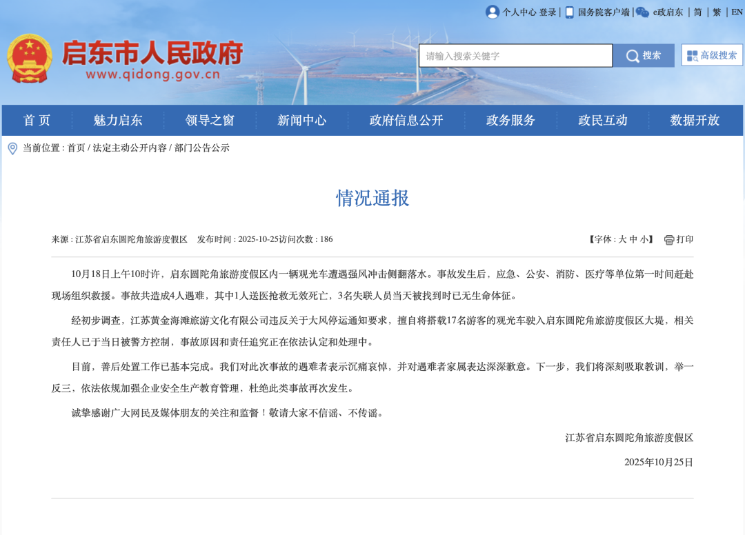 事故概述 - 10月18日上午10时许,启东圆陀角旅游度假区内一辆观光车遭遇强风冲击侧翻落水,事故共造成4人遇难,其中1人送医抢救无效死亡,3名失联人员当天被找到时已无生命体征 [1][2] - 事故观光车搭载17名游客 [1][2] - 一名亲历者老吴的老伴在事故中遇难,老吴本人在事发后等待约2个半小时获救 [5]   事故原因与责任 - 经初步调查,运营公司江苏黄金海滩旅游文化有限公司违反关于大风停运通知要求,擅自将观光车驶入度假区大堤 [1][2] - 事发当天当地刮大风,沿海阵风达9级 [3] - 相关责任人已于事故当日被警方控制,事故原因和责任追究正在依法认定和处理中 [1][2]   公司运营与善后 - 涉事观光车为景区交通工具,火车"车厢"未设窗户,属于"敞篷"观光车 [5] - 事故发生后,黄金海滩景区于10月18日17点51分发布临时闭园通知,未说明原因 [3] - 目前,善后处置工作已基本完成 [1][2]
