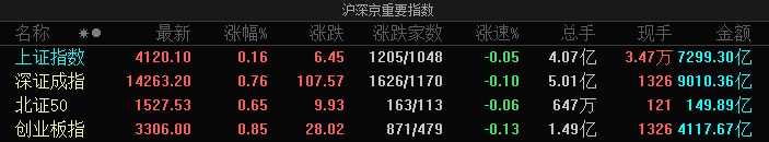 板块方面,贵金属板块持续走强,湖南白银、招金黄金双双涨停;化工板块持续走强,中国化学、红墙股份等多股涨停; 房地产板块全天活跃,大悦城、合肥城建等多股涨停;旅游酒店概念走强,大连圣亚、九华旅游涨停;下跌方面,CPO板块集 体调整,通宇通讯跌停;商业航天板块大面积飘绿,超捷股份跌超10%。总体来看,两市个股跌多涨少,下跌个股超3100只。 截至收盘,沪指报4113.65点,跌0.01%;深证成指报14155.63点,跌0.97%;创指报3277.98点,跌1.79%。盘面上,环氧丙 烷、贵金属、草甘膦板块涨幅居前;军工电子、军工信息化、太赫兹板块跌幅居前。 三大股指全天震荡调整,创业板指跌近2%领跌。 ...