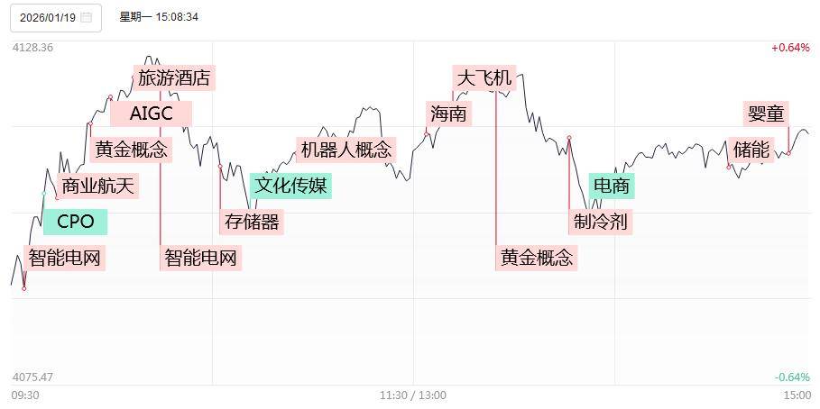 市场整体表现 - 1月19日,三大指数涨跌不一,沪指走势较强,创业板指冲高回落 [1] - 沪深两市成交额为2.71万亿元,较上一个交易日缩量3179亿元 [1] - 全市场超3500只个股上涨,共103只股涨停 [1] - 今日全市场(不含ST股、退市股)共87股涨停,连板股总数11只,20股封板未遂,封板率为81% [1] 板块异动与热点 - **电网设备概念爆发**:十余只成分股涨停,保变电气、中国西电、广电电气涨停 [1] - **机器人概念震荡拉升**:五洲新春、日盈电子涨停 [1] - **贵金属板块涨幅居前**:四川黄金、招金黄金涨停 [1] - **旅游酒店概念走强**:大连圣亚、九华旅游涨停 [1] - **商业航天概念局部活跃**:九鼎新材、越秀资本涨停,超捷股份涨超15% [1] - **CPO概念震荡下挫**:剑桥科技跌停,腾景科技、光迅科技下挫 [1] 焦点个股表现 - 实控人变更的嘉美包装录得22天15板、胜通能源22天15板、锋龙股份14连板、友邦吊顶13天9板 [1] - 股权转让的新华百货录得4连板 [1] - 智能电网板块的三变科技录得5天4板 [1] 涨停个股详细分析 智能电网板块 - 森源电气(2连板):电网设备+数据中心 [8] - 汉缆股份(2连板):特高压+数据中心 [8] - 广电电气(2连板):电网设备 [8] - 积成电子(2连板):智能电网 [8] - 宏盛华源(2连板):电网设备 [8] - 新能泰山(2连板):电力电缆 [8] - 思源电气(2连板):智能电网 [8] - 中国西电(1板):特高压 [8] - 平高电气(1板):高压GIS [8] - 保变电气(3天2板):电力变压器 [8] - 特变电工(1板):变压器(出海) [8] - 三变科技(9天5板):电力变压器 [8] - 许继电气(1板):特高压 [8] 机器人板块 - 五洲新春(2连板):通过新创供货T(传) [8] - 锋龙股份(22天14板):优选必选入主 [8] - 日盈电子(1板):人形机器人 [8] - 胜通能源(25天15板):七腾机器人收购 [9] 商业航天板块 - 越秀资本(1板):投资中科宇航 [9] - 九鼎新材(4天2板):商业航天+玻纤 [9] - 航发动力(1板):军用航空发动机 [9] 消费板块 - 新华百货(4连板):商业百货+关导体 [9] - 九华旅游(1板):旅游 [9] - 大连圣亚(3天2板):旅游 [9] AI应用与硬件板块 - 天地在线(1板):AI营销 [9] - 新里程(5天3板):AI医疗 [9] - 友邦吊顶(18天2板):AI出版 [9] - 金安国纪(3天2板):覆铜板 [9] - 博迁新材(1板):AI服务器(MLCC) [9] 其他热点板块 - 四川黄金(3天2板):黄金 [10] - 招金黄金(1板):黄金 [10] 相关行业动态与政策 - **大飞机**:欧洲航空安全局(EASA)试飞员已开始在上海对中国自主研发的C919客机进行试飞 [10] - **电网**:“十五五”期间,国家电网公司固定资产投资预计达4万亿元,较“十四五”投资增长40% [11] - **机器人**:全国机器人标准化技术委员会商业社区服务机器人工作组日前正式成立,标志着我国在商业社区服务机器人领域的标准化工作进入新阶段 [11] - **化工**:有观点认为,大宗化学品盈利迎来十年冰点,正处于产能及库存周期双拐点,有望进入上行期 [11]