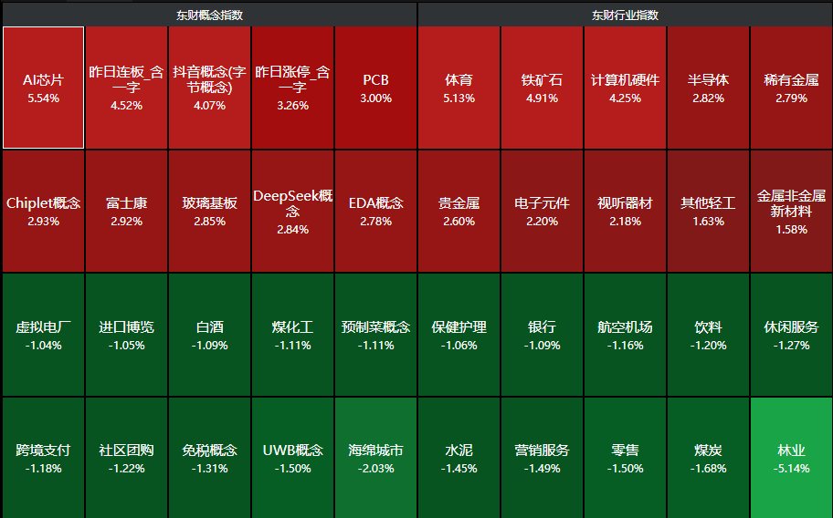 市场整体表现 - 2025年1月21日午间收盘,主要股指低开高走,沪指涨0.16%,深证成指涨0.76%,创业板指涨0.85% [1] 领涨行业与概念 - 半导体产业链集体走强,龙芯中科、大港股份等多股涨停 [1] - 贵金属板块表现活跃,湖南白银录得2连板 [1] - 锂矿概念震荡反弹,盛新锂能、大中矿业均涨停 [1] - 东财概念指数显示,AI芯片概念涨幅达5.54%,Chiplet概念涨2.93%,富士康概念涨2.92%,玻璃基板概念涨2.85%,DeepSeek概念涨2.84%,EDA概念涨2.78% [2] - 东财行业指数显示,体育行业指数涨5.13%,铁矿石行业指数涨4.91%,计算机硬件行业指数涨4.25%,稀有金属行业指数涨2.79%,电子元件行业指数涨2.20%,视听器材行业指数涨2.18% [2] 下跌行业与概念 - 消费概念震荡回调,白酒、旅游酒店等方向领跌 [1] - 东财概念指数显示,白酒概念跌1.09%,预制菜概念跌1.11%,免税概念跌1.31%,UWB概念跌1.50%,海绵城市概念跌2.03% [2] - 东财行业指数显示,饮料行业指数跌1.20%,休闲服务行业指数跌1.27%,零售行业指数跌1.50%,煤炭行业指数跌1.68%,林业行业指数跌5.14% [2]