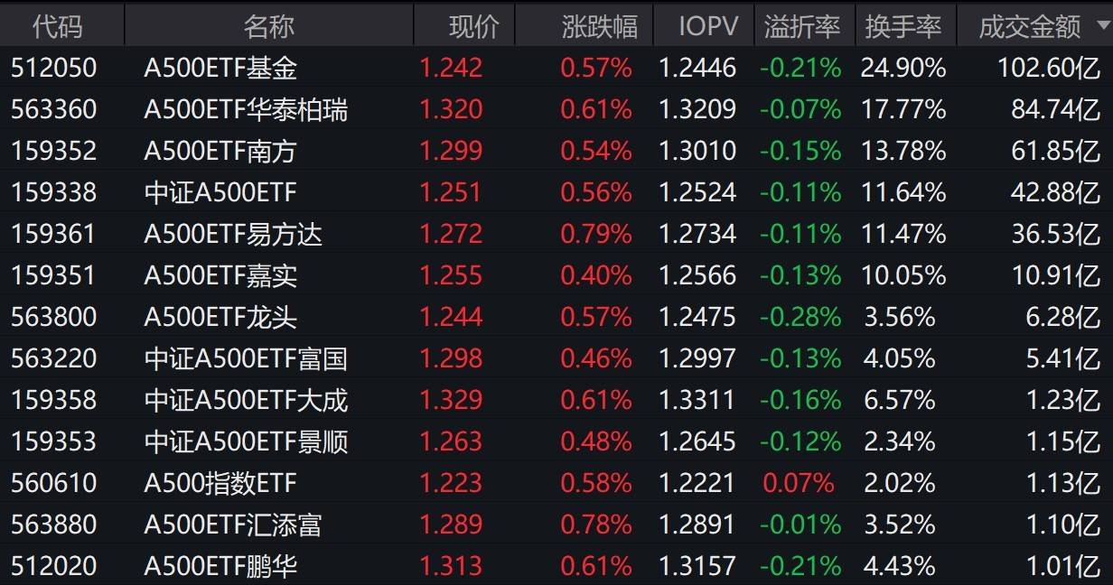 | 代码 | | 现价 | 涨跌幅 | IOPV | 流打率 和二次 | | --- | --- | --- | --- | --- | --- | | 512050 | A500ETF基金 | 1.242 | 0.57% | 1.2446 | -0.21% 24.90% | | 563360 | A500ETF华泰柏瑞 | 1.320 | 0.61% | 1.3209 | -0.07% 17.77% | | 159352 | A500ETF南方 | 1.299 | 0.54% | | 1.3010 -0.15% 13.78% | | 159338 | 中证A500ETF | 1.251 | 0.56% | | 1.2524 -0.11% 11.64% | | 159361 | A500ETF易方达 | 1.272 | 0.79% | | 1.2734 -0.11% 11.47% | | 159351 | A500ETF嘉实 | 1.255 | 0.40% | | 1.2566 -0.13% 10.05% | | 563800 | A500ETF龙头 | 1.244 | 0.57% | | 1.2475 -0 ...