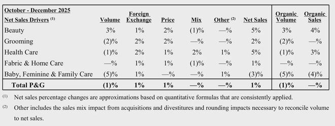 图片来源:企业公告截图 分业务看,美容品类有机销售额同比增长 4%。其中,护发品类有机销售额实现中个位数增长,核心驱 动力为拉美、欧洲地区的销量提升及依托创新的定价策略,增长部分被不利的区域销售组合部分抵消; 个护品类有机销售额同样录得中个位数增长,得益于北美地区由创新带动的销量增长与定价优化,增长 受区域销售组合的负面影响部分抵消;护肤品类有机销售额实现低个位数增长,主因是大中华区高端产 品组合占比提升与定价调整带来的积极作用,增长被销量下滑部分抵消。 男士理容品类有机销售额同比持平,北美、欧洲地区依托创新的定价策略带来的增长,完全被销量下滑 抵消。 1月23日,宝洁发布财报。披露公司2026 财年第二季度净销售额为 222 亿美元,较上年增长 1%。剔除 外汇汇率、收购及资产剥离影响后的有机销售额,与上年持平。摊薄后每股净收益为 1.78 美元,较上 年下降 5%,主要原因是本年度新增了重组相关费用。核心每股收益为 1.88 美元,与上年持平。该季度 公司经营现金流为50亿美元,净利润为43亿美元。 宝洁公司总裁兼首席执行官赛勒斯・杰祖里卡尔表示:"在当前消费者市场与地缘政治环境均面临挑战 的背景下,公司 ...