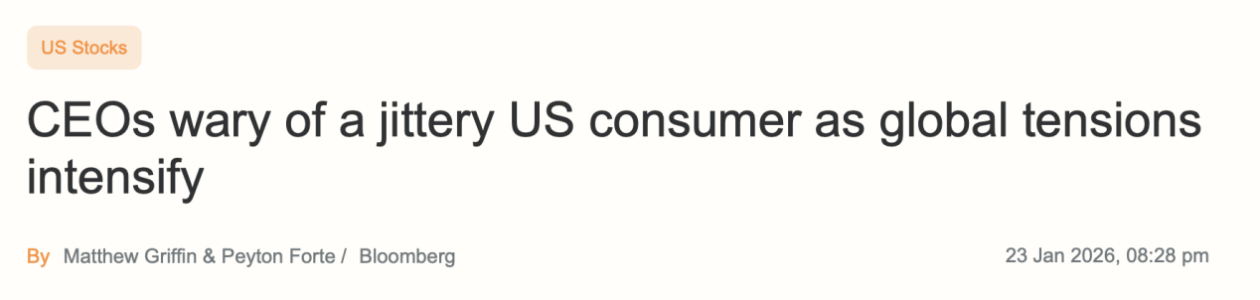 【环球网财经综合报道】据The Edge Malaysia援引彭博社报道,随着美国上市公司财报季进入深水区,一股谨慎的寒意正从企业高管的电话会议中弥漫开 来。尽管宏观经济数据显示增长依然稳健,但从航空巨头到消费品龙头,再到工业巨擘,美国企业的掌门人们正罕见地集体发出预警:地缘政治紧张局势与 政策不确定性正在重塑消费者行为,令企业规划变得异常艰难。 这一悲观论调与亮眼的经济数据形成了鲜明反差。数据显示,去年美国经济增长稳健,消费者支出展现出惊人韧性。然而,在这份看似光鲜的成绩单背后, 企业高管们却在为一个充满动荡的未来定调。随着标普500指数连续三年实现两位数增长后处于历史高位,市场几乎没有犯错空间,而美国政府持续重塑贸 易关系与国际政策的举动,正成为悬在企业头顶的达摩克利斯之剑。 工业领域的需求阻力同样挥之不去。工业分销商Fastenal的首席财务官形容美国经济"继续发出混杂信号,尤其是在工业领域"。物流公司JB Hunt Transport Services的高管则表示,年初货运市场依然不稳定,尽管收紧的移民政策限制了劳动力供应——这一因素通常会推高运输费率,但并未带来预期的市场提 振。多元化制造商3M在发 ...