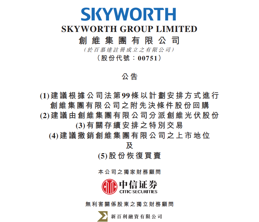 创维集团:拟回购股份、申请退市,分派「创维光伏」并将以介绍形式在香港上市