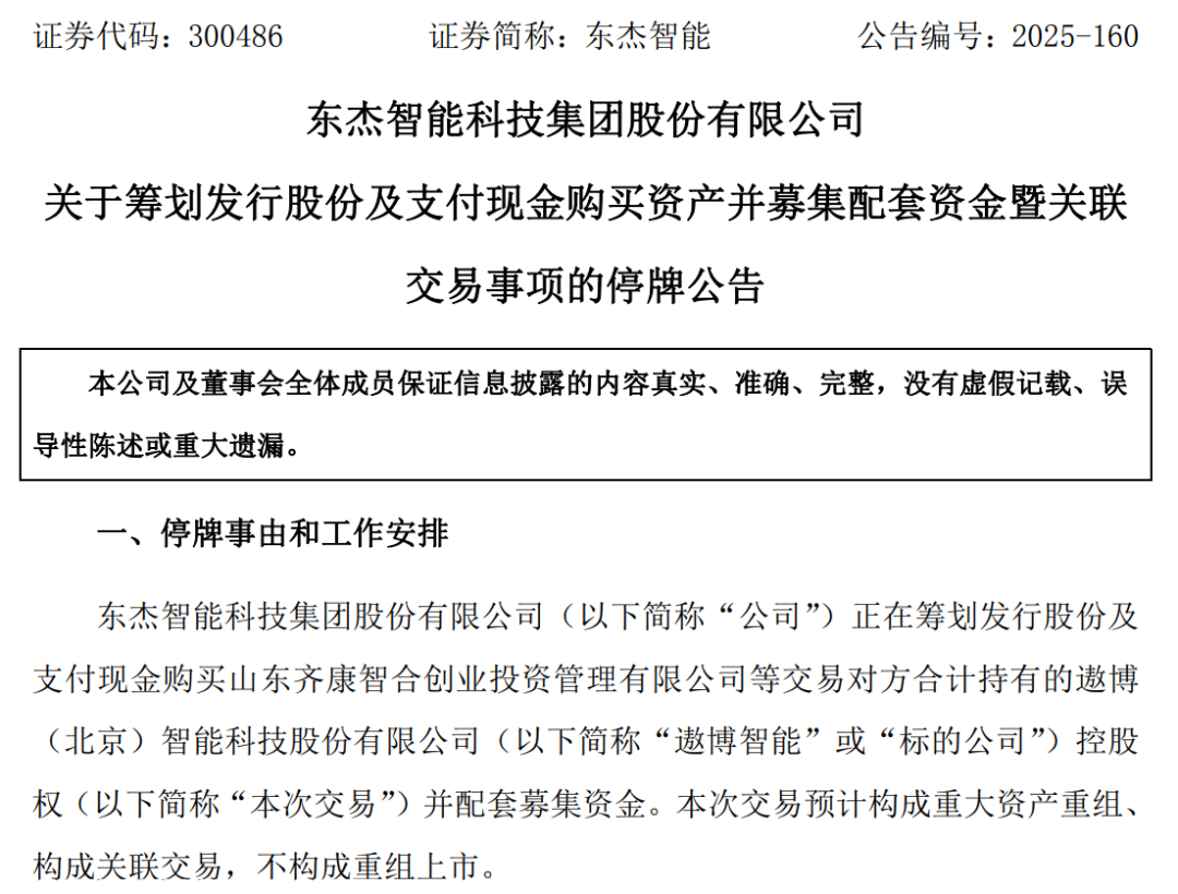 每经AI快讯,东杰智能(SZ 300486,收盘价:21.59元)12月16日晚间发布公告称,东杰智能科技集团 股份有限公司正在筹划发行股份及支付现金购买山东齐康智合创业投资管理有限公司等交易对方合计持 有的遨博(北京)智能科技股份有限公司控股权并配套募集资金。本次交易预计构成重大资产重组、构 成关联交易,不构成重组上市。因有关事项尚存不确定性,为了维护投资者利益,避免对公司证券交易 造成重大影响,经公司申请,公司证券(证券品种:A 股股票,证券简称:东杰智能,证券代码: 300486.SZ)自2025年12月17日开市时起开始停牌。 2024年1至12月份,东杰智能的营业收入构成为:智能物流装备占比99.86%,其他业务占比0.14%。 截至发稿,东杰智能市值为103亿元。 (记者 曾健辉) 每经头条(nbdtoutiao)——"太空快递"来了?全国首个民营飞船成功"上天"!背后公司创始人:正积 极开发"中型货运飞船"低成本产品 ...