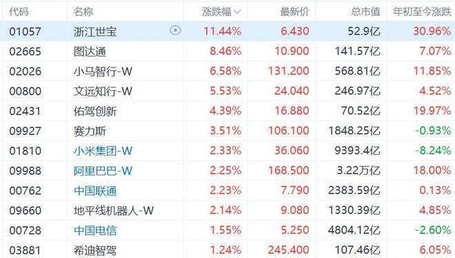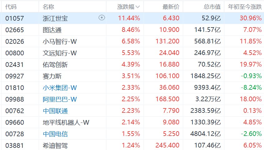 港股智驾概念股午后涨幅扩大 浙江世宝涨超12%