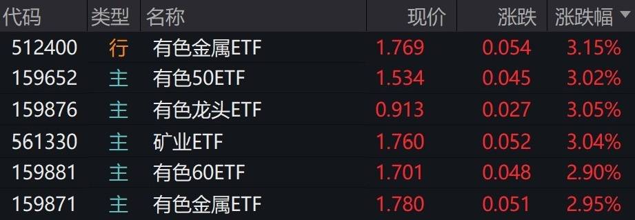 有色金属概念股走强,有色、矿业相关ETF涨约3%