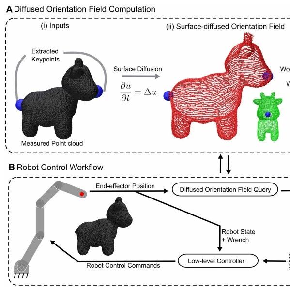 当我们切开一根香蕉,削掉一个土豆的皮,或是清洗一个形状不规则的盘子时,我们很少会意识到自己大脑 和双手的配合是多么精妙。我们能毫不费力地适应各种物体的 曲面、弧度和比例 ,即使是第一次见到的物 体也能轻松上手。然而,这项对于人类来说如同本能的日常任务,却一直是机器人领域难以逾越的鸿沟。 为什么机器人连削苹果皮都那么困难?根本原因在于,香蕉、杯子、土豆这类曲面物体,不像平整的桌面, 它们 没有一个全局统一的参考坐标系 。在一个曲面上,"向前"或"沿着表面"的方向,在每一点都可能不 同。这使得机器人很难将在一个物体上学到的技能(比如削一个直溜的黄瓜)应用到另一个形状稍有不同的 物体上(比如一个弯曲的黄瓜)。机器人学到的似乎总是一套僵硬的、针对特定物体的动作序列,而非通用 的"技能"。 近日,一篇最新发表在 国际顶级期刊Science Robotics 的研究,为解决这一根本性挑战带来了曙光。研究人 员们提出了一种名为 "扩散方向场" (Diffused Orientation Fields)的创新方法,它 为机器人打造了一套能 够实时适应任何物体几何形状的"智能导航系统",让机器人拥有了在复杂曲面物体上举一反三、 ...
