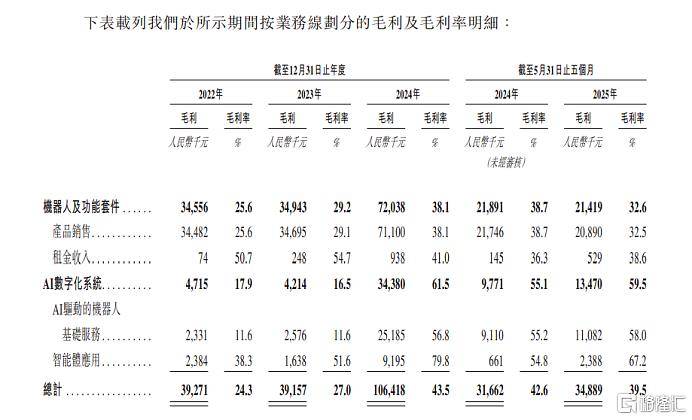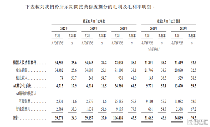 公司业务模式 - 公司是领先的机器人服务智能体企业,提供有实体及无实体机器人形态的智能体,产品服务涵盖机器人、功能套件及AI数字化系统 [2] - 业务场景覆盖酒店、医疗、商业楼宇等多个领域 [2] - 公司通过销售、租赁、订阅、佣金等多种模式获取收入,客户包括企业客户、分销商及个人消费者 [3] 财务表现 - 公司总营收在2022年为1.61亿元,2023年略微减少10.0%至1.45亿元,2024年大幅回升68.6%至2.45亿元,2025年前五个月由2024年同期的0.74亿元增加18.9%至0.88亿元 [4] - 2022年净亏损3.65亿元,2023年减少27.6%至2.65亿元,2024年进一步减少30.1%至1.85亿元,但2025年前五个月净亏损较2024年同期增加40.9%,由0.84亿元增至1.18亿元 [4] - 2022年至2024年毛利率分别为24.3%、27.0%、43.5%,2025年前五个月为39.5% [5] - 2022年至2024年净利率亏损率分别为226.6%、182.2%、75.6%,2025年前五个月亏损率为134.0% [6] 收入构成 - 机器人及功能套件收入占主导但占比下降,2022年至2024年占比分别为83.6%、82.4%、77.2%,2025年前五个月占74.4% [8] - AI数字化系统收入占比逐步上升,2022年至2024年占比分别为16.4%、17.6%、22.8%,2025年前五个月占25.6% [8] - 酒店场景是核心收入来源,2022年至2024年收入占比分别为70.1%、95.1%、83.0%,2025年前五个月占93.2% [8] 市场地位与竞争格局 - 2024年,以来自中国的收入计,公司为中国机器人服务智能体市场最大参与者,市场份额为6.3% [10] - 在中国酒店场景机器人服务智能体市场,公司位居首位,市场份额为13.9% [10] - 行业竞争激烈,中国机器人服务智能体市场前五大参与者合计市场份额为25.4%,酒店场景市场前五大参与者合计市场份额为27.4% [10] 客户与供应商集中度 - 客户集中度较低,2022年至2025年前五个月,五大客户产生的收入分别占总收入的23.8%、10.9%、14.1%及11.9% [11] - 同期最大客户产生的收入分别占总收入的5.2%、3.4%、4.3%及4.2% [11] - 对供应商依赖度增加,2022年至2025年前五个月,向五大供应商采购金额占比从24.8%升至62.7%,向最大供应商采购金额占比从6.4%升至38.4% [11] 财务状况与资本结构 - 负债净额持续增加,从2022年的11.04亿元增至2025年5月31日的16.17亿元,主要因授予特定投资者的赎回权产生大额赎回负债 [12] - 累计亏损规模较大,截至2025年5月31日累计亏损为14.71亿元 [12] 公司治理与股权结构 - 截至最后实际可行日期,支女士与云迹天使管理共同控制行使公司已发行股本总额约36.52%的投票权,为公司控股股东 [13] - 公司核心管理层拥有丰富行业经验,并已向77名参与者授予相当于4,376,375股相关股份的股份奖励 [14]