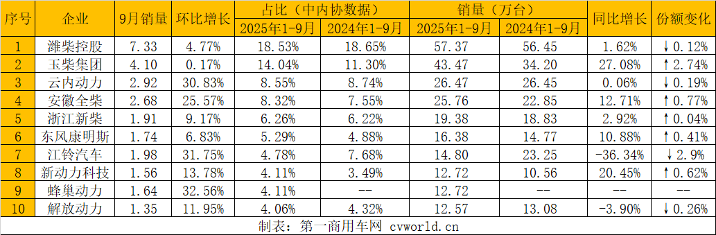 多缸柴油机:1-9月销近310万台 同比增5.6% 9月,我国多缸柴油机销量为34.51万台,环比增长12.51%,同比增长15.42%;1-9月,累计销量309.59万台,同比增长5.58%,增幅较1-8月提升超1 个百分点。其中,累计销量居于行业前十的企业分别是:潍柴、玉柴、云内、全柴、新柴、东风康明斯、江铃(000550.SZ)、新动力科技、蜂巢动 力和解放动力,排名再生变动。前十名累计销量占多缸柴油机总销量的78.06%,与1-8月(77.95%)相比提升了0.11个百分点。 从9月单月来看,前十企业多缸柴油机销量均实现了环比增长。其中,潍柴依然是冠军,销售7.33万台,实现环比增长4.77%;第二名玉柴,销量为 4.10万台,与上月相比有微小增长;第三名则是云内动力,销量为2.92万台,实现环比增长30.83%。9月,面对传统旺季,云内动力抓住市场机 遇,销量环比实现较快增长。排名第四的还是安徽全柴,9月销售多缸柴油机2.68万台,实现环比增长25.57%。前四名是9月仅有的销量超2万台的 企业。 | 序号 | 企业 | | 9月销量 环比增长 | 占比(中内协数据) | | | 销量(万台) | ...