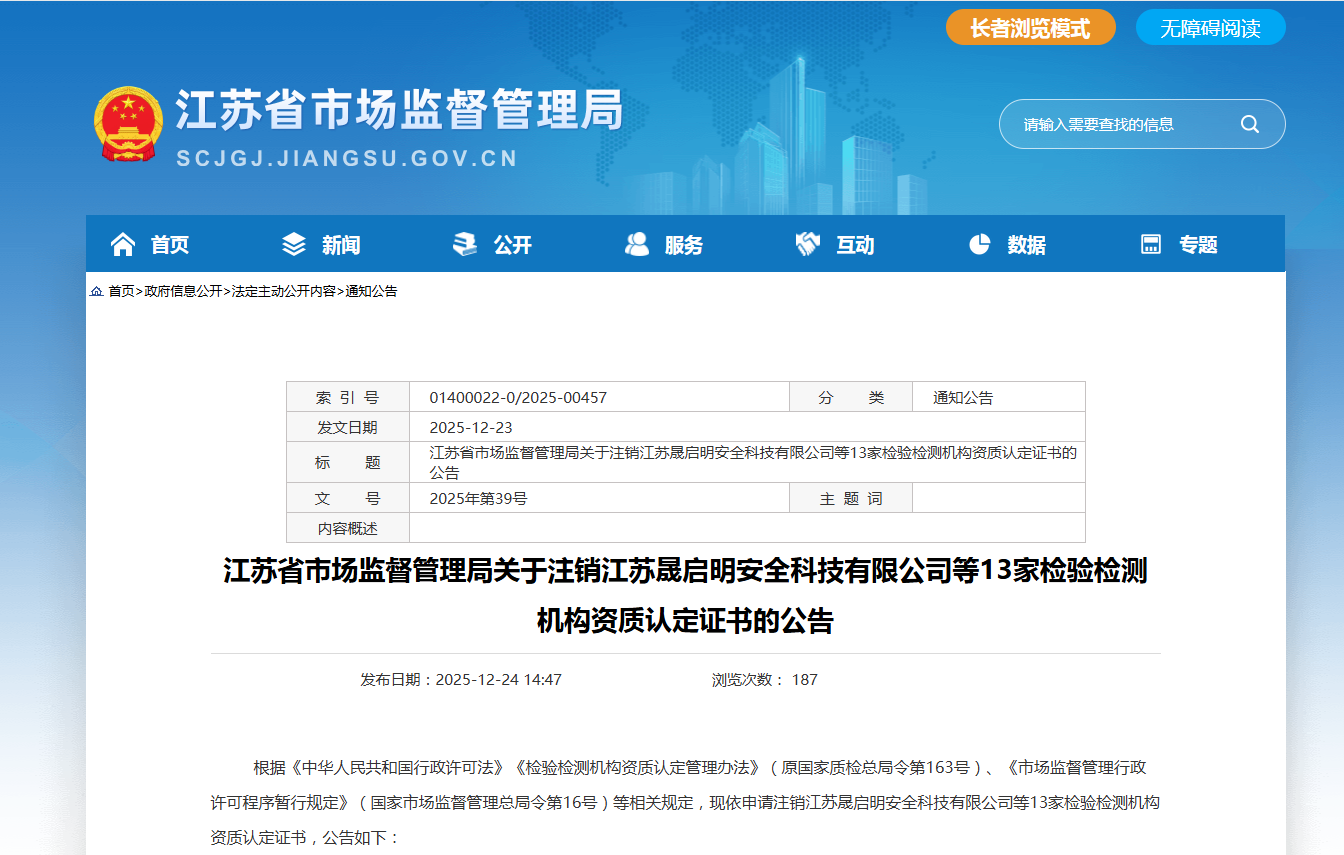 1.江苏晟启明安全科技有限公司检验检测机构资质认定证书(编号231009341135); | 索 引 号 | | 01400022-0/2025-00457 | 分 | 第 | 通知公告 | | --- | --- | --- | --- | --- | --- | | 发文日期 | | 2025-12-23 | | | | | 标 | 题 | 公告 | 江苏省市场监督管理局关于注销江苏晟启明安全科技有限公司等13家检验检测机构资质认定证书的 | | | | す | 북 | 2025年第39号 | 主题词 | | | | 内容概述 | | | | | | 根据《中华人民共和国行政许可法》《检验检测机构资质认定管理办法》(原国家质检总局令第163号)、《市场监督管理行政许可程序暂行规定》(国家 市场监督管理总局令第16号)等相关规定,现依申请注销江苏晟启明安全科技有限公司等13家检验检测机构资质认定证书,公告如下: 9.苏州慧诚电力检测有限公司检验检测机构资质认定证书(编号241017340003); 10.南通通凯机动车检测有限公司检验检测机构资质认定证书(编号231005340949)(机动车检验检测机构) ...
