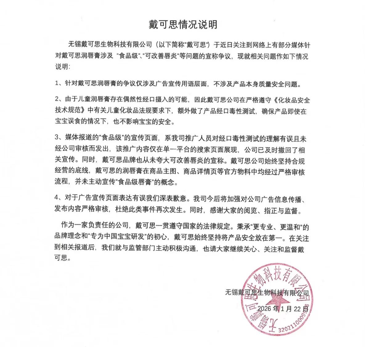 来源丨凤凰网财经《公司研究院》 近日 ,戴可思品牌 被媒体曝光在电商平台销售婴儿护唇膏时,使用了 " 食品级润唇膏 " 、 " 宝宝误舔无忧 " 等宣传语。 该品牌由刘涛代言,在天猫官方旗舰店其详情页中提到,该婴儿护唇膏全网累计热销 2900 万件,位居天猫婴儿护唇膏好评榜&热销榜 TOP1 。 但根据 2022 年 1 月起正式施行的《儿童化妆品监督管理规定》,儿童化妆品标签不得标注 " 食品级 "" 可食用 " 等词语或者与食品有关图案。 宣传触及监管红线,事件曝光后迅速引发关注。公开资料显示,戴可思( Dexter )是无锡戴可思生物科技有限公司 ( 下称 " 戴可思公司 ") 旗下 母婴全品类日化品牌。无锡市新吴区市场监督管理局已对戴可思公司正式立案调查。 面对舆论压力,戴可思发布了官方情况说明。首先强调争议只涉及广告宣传用语层面,不涉及产品本身质量安全问题。其次称产品做过 " 经口毒性测 试 " ,将问题归因于 " 推广人员理解有误 " , 且 " 未经公司审核而发出 " ,并表示已撤回了相关宣传文案。 此外,也有消费者提到,在抖音商城购买戴可思婴儿面霜使用后过敏, " 孩子好几天没睡觉,脸上都是疙 ...