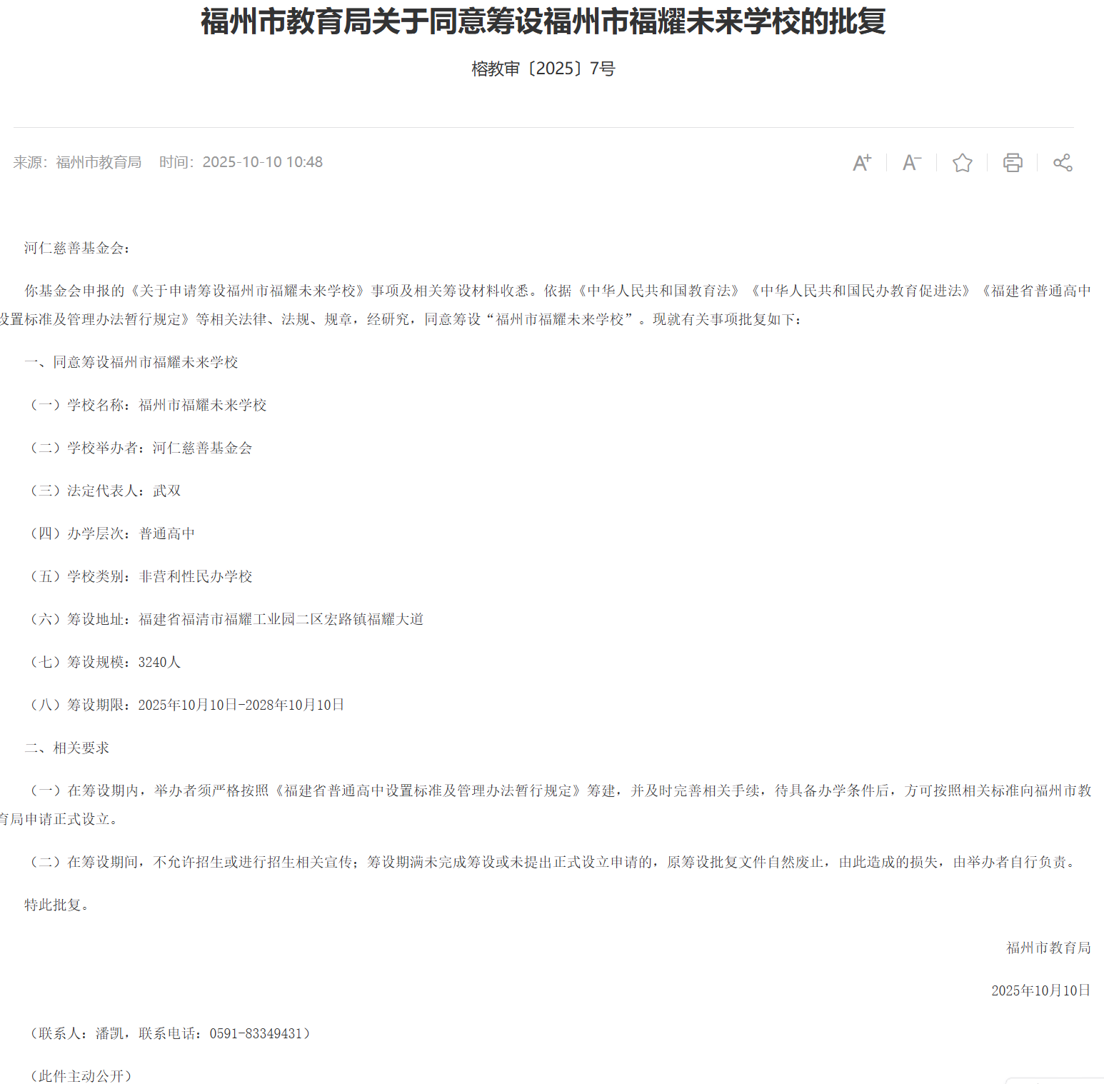 学校设立批复 - 福州市教育局于2025年10月10日批复同意筹设福州市福耀未来学校 [1][2] - 学校举办者为河仁慈善基金会,法定代表人为武双 [1][2] - 学校办学层次为普通高中,类别为非营利性民办学校 [1][2] 学校规划与规模 - 学校筹设地址位于福建省福清市福耀工业园二区宏路镇福耀大道 [1][2] - 学校规划筹设规模为3240人 [1][2] - 筹设期限为三年,自2025年10月10日至2028年10月10日 [1][2] 筹设期要求 - 筹设期内举办者须严格按照福建省普通高中设置标准筹建并完善相关手续 [2] - 筹设期间不允许招生或进行招生相关宣传 [2] - 筹设期满未完成筹设或未提出正式设立申请,原筹设批复文件自动失效 [2]