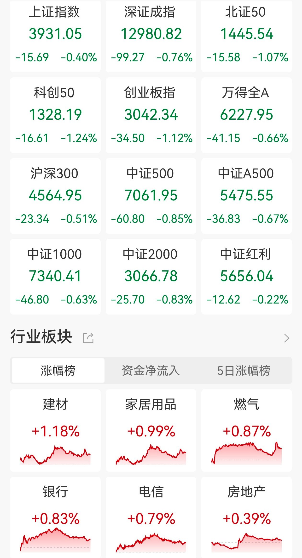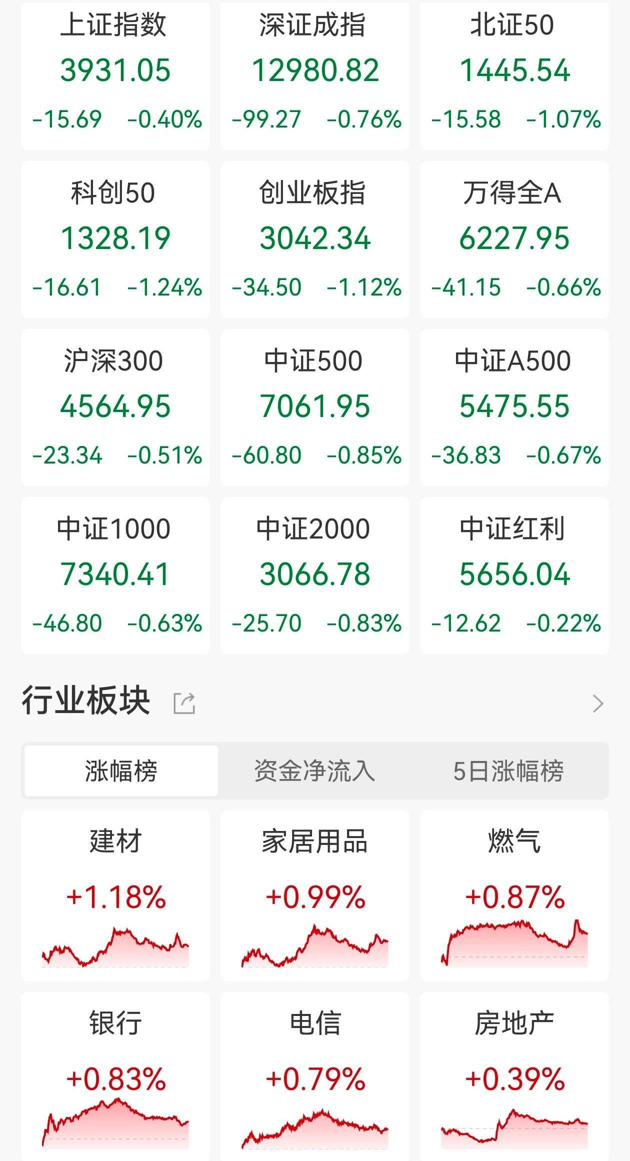 A股三大指数今日集体下跌,截至收盘,沪指跌0.4%报3931点,深证成指跌0.76%,创业板指跌1.12%。全市场成交额1.72万亿元,较前一交易日缩量200亿 元,逾3800股下跌。 盘面上,水产养殖板块大跌,天马科技跌停;预制菜概念走低,国联水产跌逾11%;有机硅板块下挫,东岳硅材跌逾9%;美容护理、化妆品概念走弱,丽 人丽妆跌停;光伏设备板块震荡下行,国晟科技跌停;电池、氟化工、船舶制造及教育等板块跌幅居前。另外,海南板块走高,海南海药涨停;水泥建材板 块活跃,亚泰集团、国统股份双双涨停;银行股走强,中行、工行创历史新高;锂矿概念、SPD概念及房地产服务等板块涨幅居前。(格隆汇) | 涨幅榜 | 资金净流入 | 5日涨幅* | | --- | --- | --- | | 建材 | 家居用品 | 煤 | | +1.18% | +0.99% | +0.879 | | 银行 | 电信 | 房地产 | | +0.83% | +0.79% | +0.399 | | 上证指数 | 深证成指 | 北证5C | | --- | --- | --- | | 3931.05 | 12980.82 | 1445.5 | | ...