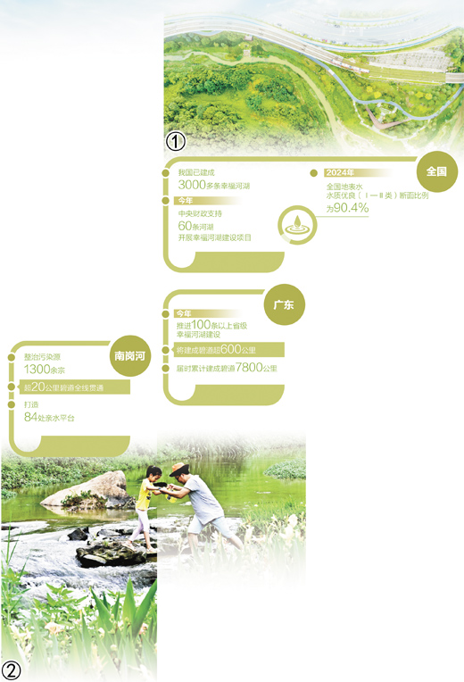 ●加强水源涵养区保护修复,加大重点河湖保护和综合治理力度,恢复水清岸绿的水生态体系 ●完善河湖管理保护机制,强化河长制、湖长制 ——节选自"十四五"规划纲要 图①:南岗河静静流淌。 邓志伸摄 图②:南岗河成为市民亲水休闲的好去处。 区炳坚摄 数据来源:生态环境部、水利部等 工作日的下午,沈凯行走在南岗河畔,开始日常的巡河。"最近晚上有污水排进河里,不知哪来的。"河 边散步的居民看到他,打个招呼便上前来反映问题。 "还记得具体时间和地点吗?"沈凯认真记录,向大家承诺将协调环保部门开展夜间排查。 南岗河位于广东省广州市黄埔区中东部,全长24千米,流域总人口约43万,是岭南都市穿城河流典型代 表。从曾经的臭水沟,到如今河畅、水清、岸绿、景美,黄埔区长岭街道党工委书记沈凯作为街道总河 长,是这条河流大变身的参与者和见证者。任职几年来,他始终坚持每周两次以上的专项巡查,解决居 民反映的问题,对照台账重点检查排污口、易淤积点等,随时观察河面漂浮物、临河绿化状态。 经过全流域精心打造,南岗河成为繁华的绿色长廊,实现了人水和谐、水城融合发展,2024年入选水利 部"幸福河湖"优秀案例。南岗河的重生,映照出我国3000多条幸福 ...
