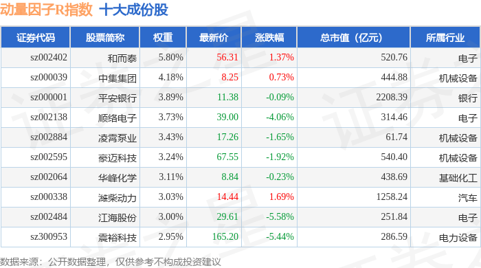 证券之星消息,10月30日,动量因子R(480057)指数报收于2880.13点,跌0.93%,成交505.13亿元,换 手率2.11%。当日该指数成份股中,上涨的有12家,大中矿业以9.99%的涨幅领涨,下跌的有38家,瑞达 期货以7.39%的跌幅领跌。 动量因子R(480057)指数十大成份股详情如下: | 动量因子R指数 十大成份股 | | --- | | 证券代码 | 股票简称 | 权重 | 最新价 | 涨跌幅 | 总市值(亿元) | | 所属行业 | | --- | --- | --- | --- | --- | --- | --- | --- | | sz002402 | 和而泰 | 5.80% | 56.31 | 1.37% | | 520.76 | ■ 电子 | | sz000039 | 中隼生厅 | 4.18% | 8.25 | 0.73% | | 444.88 | 机械设备 | | sz000001 | 平安银行 | 3.89% | 11.38 | -0.09% | 4 7 | 2208.39 | 银行 | | sz002138 | 顺络电子 | 3.73% | 39.00 | -4.06 ...