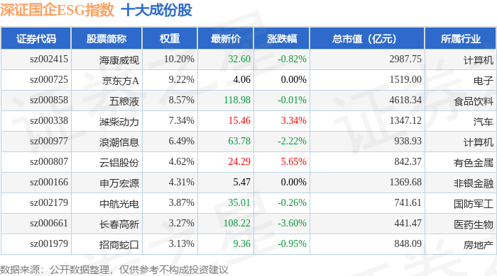 证券之星消息,11月3日,深证国企ESG(970055)指数报收于1399.95点,涨0.18%,成交406.36亿元, 换手率1.2%。当日该指数成份股中,上涨的有29家,中新赛克以10.01%的涨幅领涨,下跌的有19家,中 材科技以8.51%的跌幅领跌。 深证国企ESG(970055)指数十大成份股详情如下: | 证券代码 | 股票简称 | 权重 | 最新价 | 涨跌幅 | 总市值(亿元) | 所属行业 | | --- | --- | --- | --- | --- | --- | --- | | sz002415 | 海康威视 | 10.20% | 32.60 | -0.82% | 2987.75 | 计算机 | | sz000725 | 京东方A | 9.22% | 4.06 | 0.00% | 1519.00 | ● 电子 | | sz000858 | 五根液 | 8.57% | 118.98 | -0.01% | 4618.34 | 食品饮料 | | sz000338 | 潍柴动力 | 7.34% | 15.46 | 3.34% | S 1347.12 | 汽车 | | sz000977 | 浪潮 ...