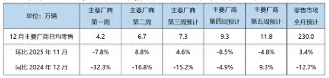 【环球网科技综合报道】12月20日消息,乘联分会日前发布的最新报告显示,初步推算12 月狭义乘用 车零售总市场规模约为230万辆,环比增长3.4%,同比下降12.7%。其中新能源零售量预计为138万左 右,渗透率预计可达60%。 第三周虽限时促销结束,但前期订单持续交付,预计日均零售可达7.3万辆。进入下旬,消费者观望情 绪浓厚,市场增长动力减弱,第四周预计日均零售 9.3 万辆。 第五周厂商进入年度目标冲刺阶段,日均零售预计攀升至 11.8 万辆(受去年同期低基数影响,同比增 长 9.3%,环比下降 4.8%)。综合全月,预计零售市场 230 万,环比增长 3.4%,同比下降12.7%。(思 瀚) 来源:环球网 | 单位:万辆 | 主要厂商 | 主要厂商 | 主要厂商 | 主要厂商 | 主要厂商 | 零售市场 | | --- | --- | --- | --- | --- | --- | --- | | | 第一周 | 第二周 | 第三周预计 | 第四周预计 | 第五周预计 | 全月预计 | | 12月主要厂商日均零售 | 4.2 | 6.7 | 7.3 | 9.3 | 11.8 | 230.0 | | 环 ...