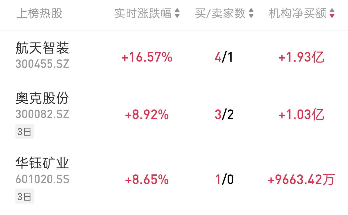 龙虎榜机构热股 今天机构龙虎榜上榜41只个股,净买入15只,净卖出26只。当日机构买入最多的个股前三位是:航天智装(1.93亿)、奥克股份(1.03亿)、华钰矿业 (9663万)。 | 上榜热股 | 实时涨跌幅♀ 买/卖家数↕ | | | --- | --- | --- | | 航天智装 | +16.57% | 4/1 | | 300455.SZ | | | | 奧克股份 | | | | 300082.SZ | +8.92% | 3/2 | | 3日 | | | | 华钰矿业 | | | | 601020.SS | +8.65% | 1/0 | 航天智装 龙虎榜显示,今日4家机构净买入1.93亿。 一、油服 胜利股份 个股龙虎榜 公司在全国从事清洁能源天然气业务推广和应用,为工业、商业、居民等领域提供天然气应用服务,在交通运输领域为使用天然气的车辆提供天然气供应,并在 天然气创新领域提供解决方案。 石化油服 个股龙虎榜 公司是中石化集团内唯一一家工程技术服务的主体,位居全球油服行业第四位 根据国泰海通研报,根据OPEC会议,12月份将如期增产13.7万桶/天,但OPEC叫停2026Q1增产计划。此外OPEC自 ...