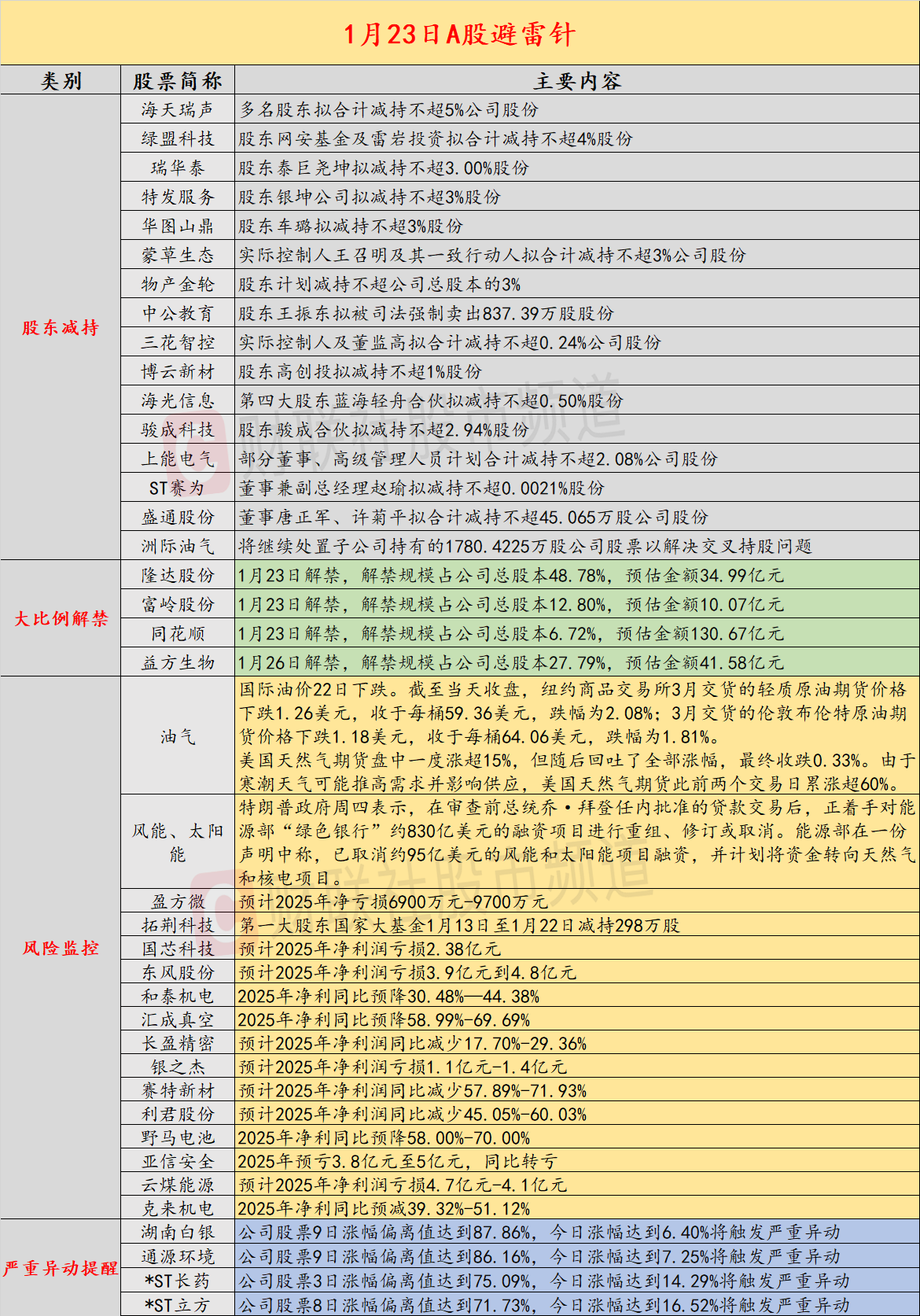 海外预警 1、英特尔预计第一季度调整后每股收益0美元,市场预估0.08美元;预计第一季度营收117亿美元至127亿美元,市场预估125.6亿美元。英特尔盘后大跌,一 度跌超13%。 导读:智通财经1月23日投资避雷针,近日,A股及海外市场潜在风险事件如下。国内经济信息方面包括:1)居民短期消费贷余额跌至9.5万亿元下方,为三 年来最低;2)市场监管总局首次对公用事业领域企业并购亮红牌;公司方面重点关注包括:1)3连板盈方微预计2025年净亏损6900万元-9700万元;2)海 天瑞声多名股东拟合计减持不超5%公司股份;海外市场重点关注包括:1)英特尔发布疲软一季度业绩指引,盘后股价一度大跌超13%;2)美国能源部取 消约95亿美元风能和太阳能项目,并计划将资金转向天然气和核电项目。 经济信息 1、市场监管总局1月21日禁止佛山市南海区蓝鸟燃气有限公司与佛山市南海区南官燃气有限公司等经营者新设合营企业案。该案是《中华人民共和国反垄断 法》实施以来,市场监管总局首次禁止公用事业领域经营者集中,有效维护了瓶装液化石油气市场竞争秩序,预防集中后实体推高瓶装液化石油气价格、增 加群众负担,切实维护消费者利益。 2、我国 ...