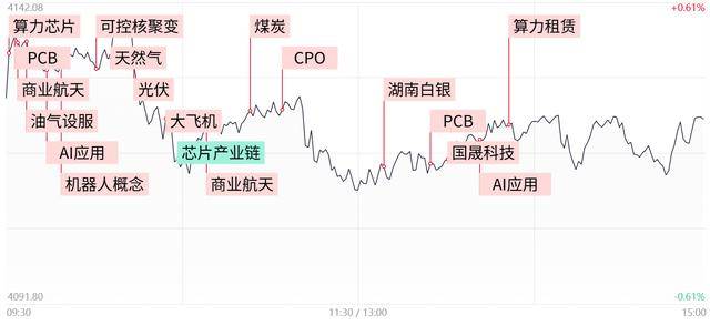 编辑:何颖曦 盘面上,商业航天概念走强,巨力索具、西部材料、九鼎新材等多股涨停。油气概念走高,洲际油 气、蓝焰控股、胜利股份等涨停。大飞机概念活跃,润贝航科、航发科技等涨停。煤炭板块异动拉升, 大有能源涨停。PCB概念走强,鹏鼎控股、金安国纪等多股涨停,算力租赁概念震荡走高,中贝通信涨 停。可控核聚变概念震荡拉升,浙富控股、雪人集团等涨停。建材、航空、船舶、石油、供气供热等板 块涨幅居前;保险、日用化工、半导体等板块跌幅居前。 中国经济周刊-经济网讯 截至收盘,上证指数报4122.58点,涨幅0.14%,成交额12017.64亿元;深 证成指报14327.05点,涨幅0.50%,成交额14899.68亿元;创业板指报3328.65点,涨幅1.01%,成交额 6815.35亿元。 ...
